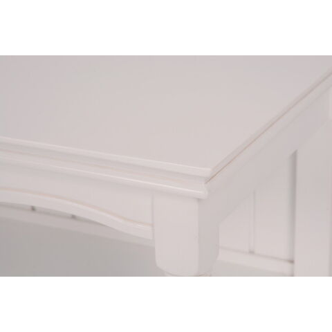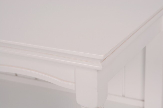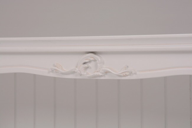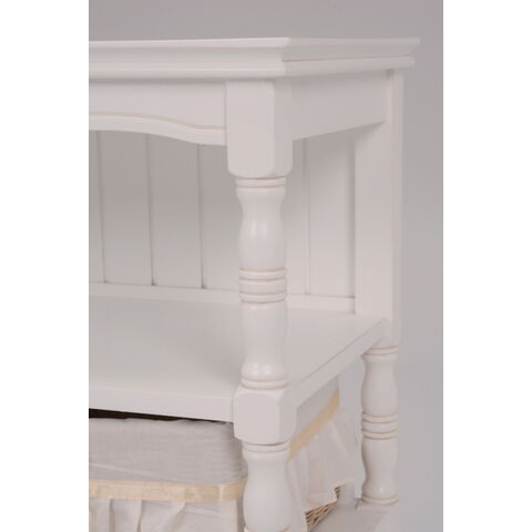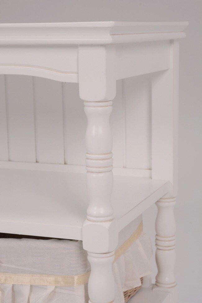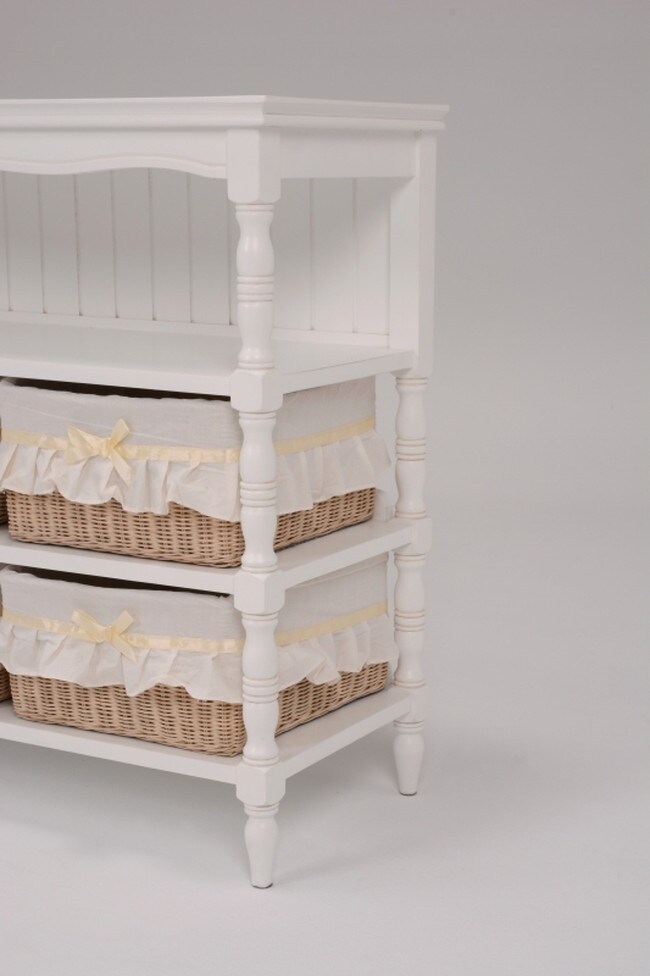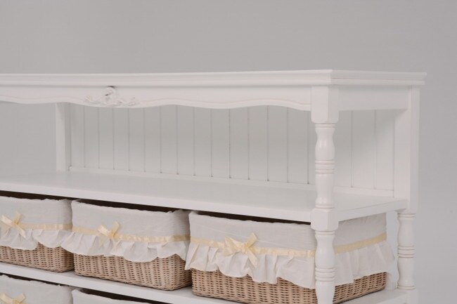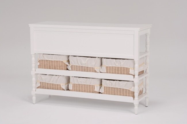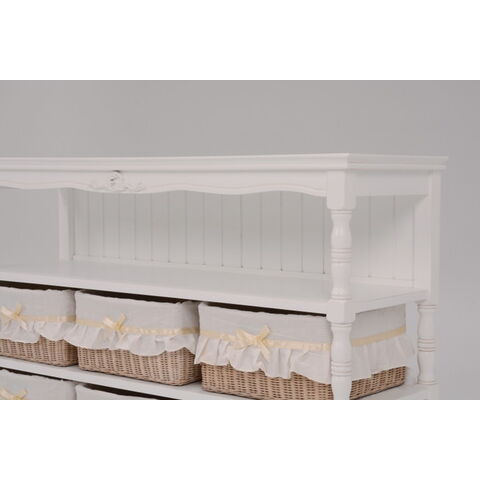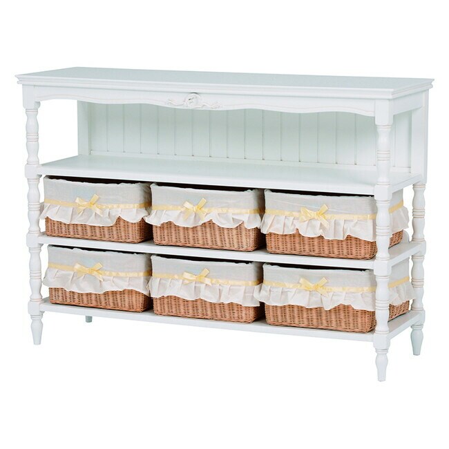 エレガントな彫刻が施された引出しつきアンティーク風ワイドキャビネット。小物が収納できる内布付きバスケット6つ付き。