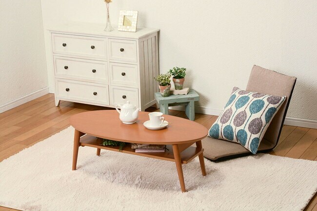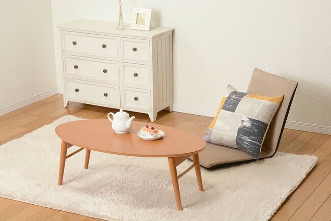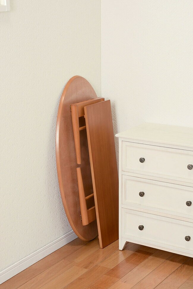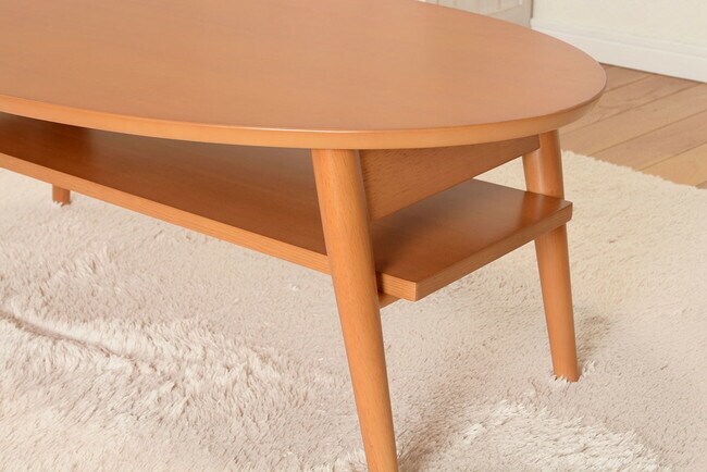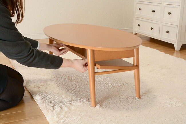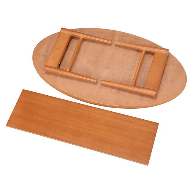 コンパクトで使い勝手の良い折れ脚テーブル。棚もついているので雑誌や新聞をストック可能。オーバルサイズ。
