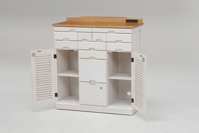 多引き出しのFAX台。隠しキャスターがついているので移動もラク。鍵付き