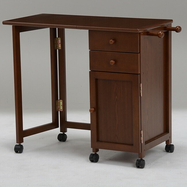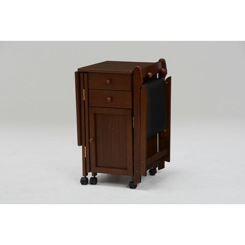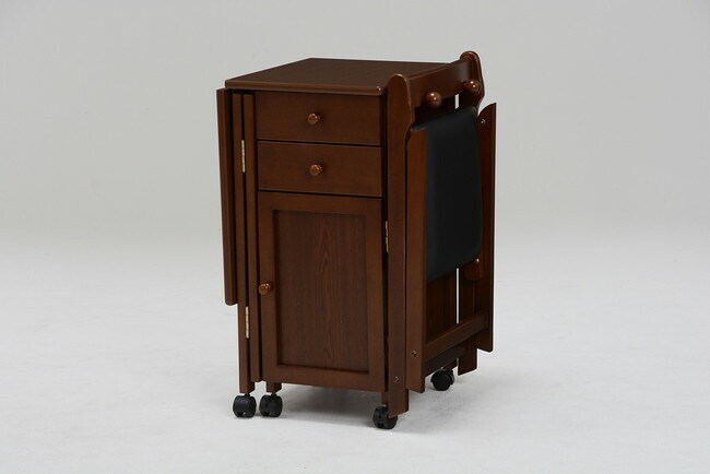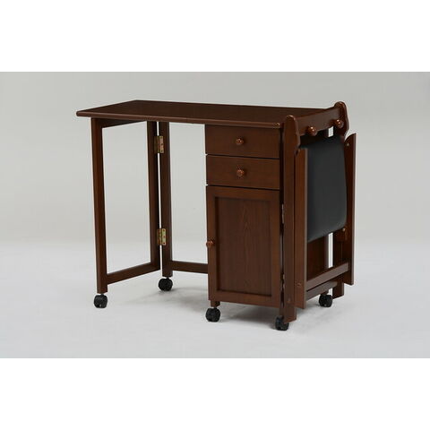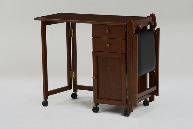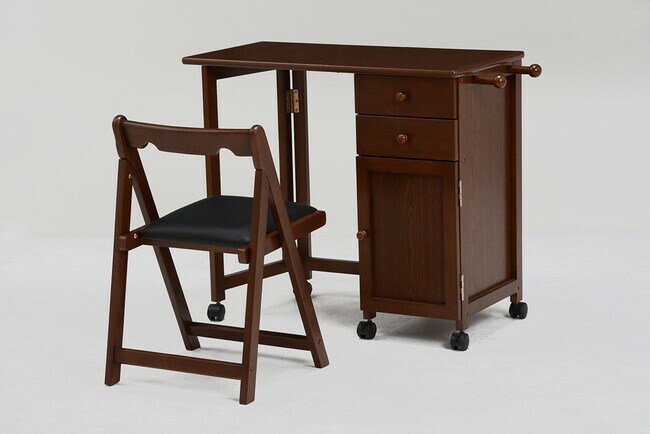 使わないときは天板をたたんで収納できるキャスター付きデスク。引出しや扉収納もあって便利。