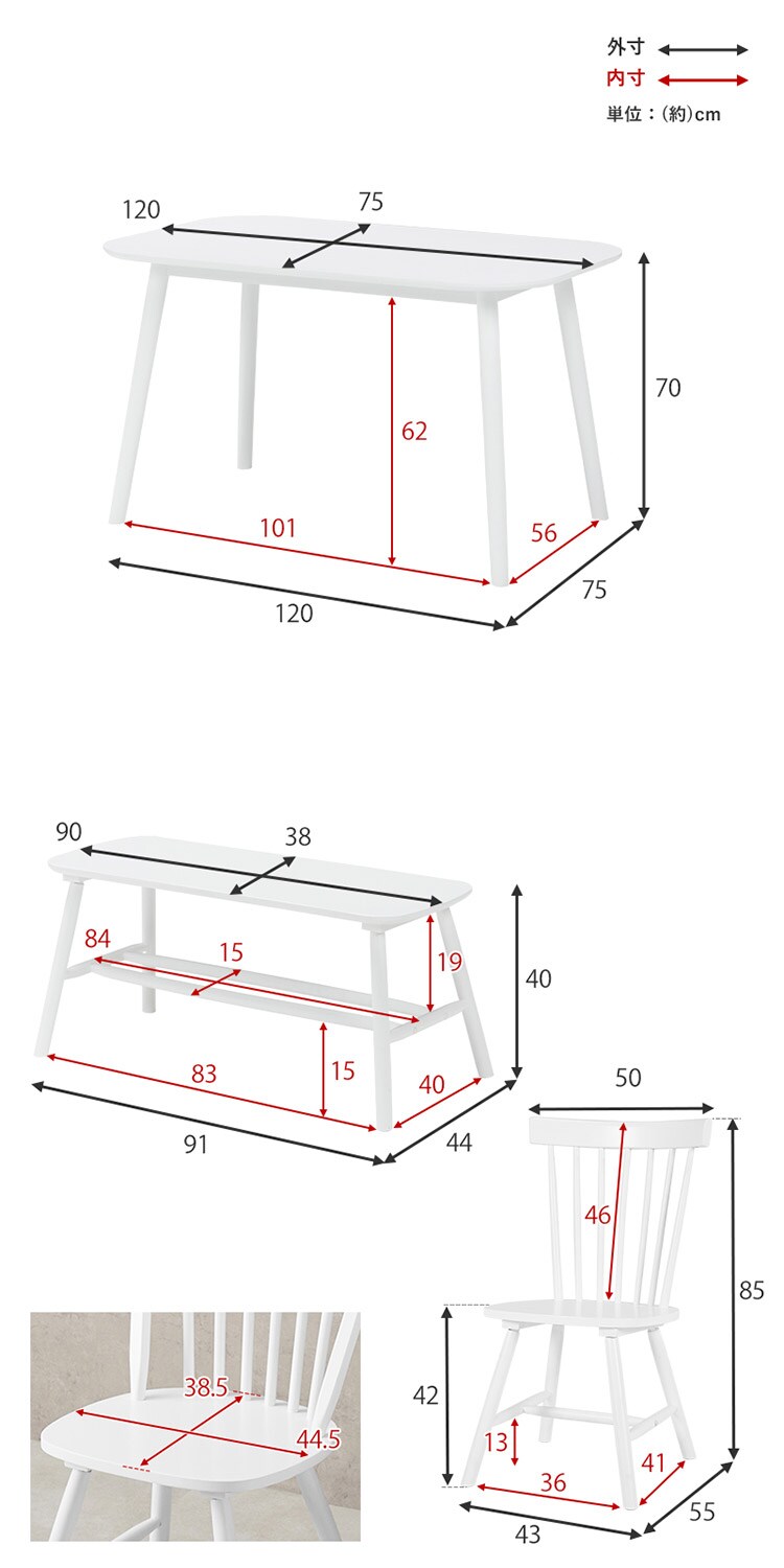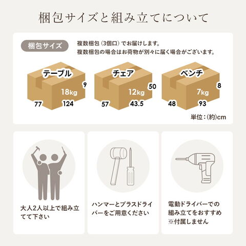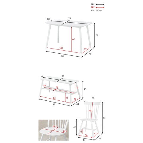 テーブル:(約)幅120×奥行75×高さ70cm、チェア:(約)幅50×奥行55×高さ85×座面高42cm、ベンチ:(約)幅91×奥行44×高さ40cm