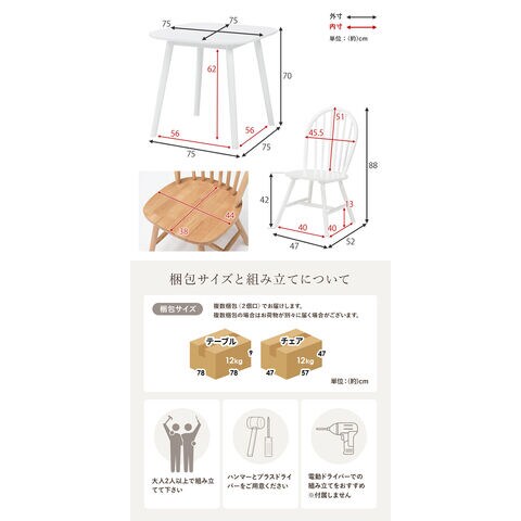 テーブル:(約)幅75×奥行75×高さ70cm、チェア:(約)幅47×奥行52×高さ88×座面高42cm