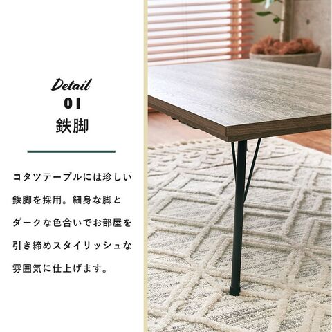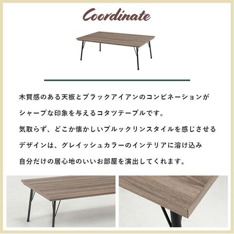 グレイッシュな木目調天板とスチール脚がブルックリンスタイルを感じさせるコタツテーブル。