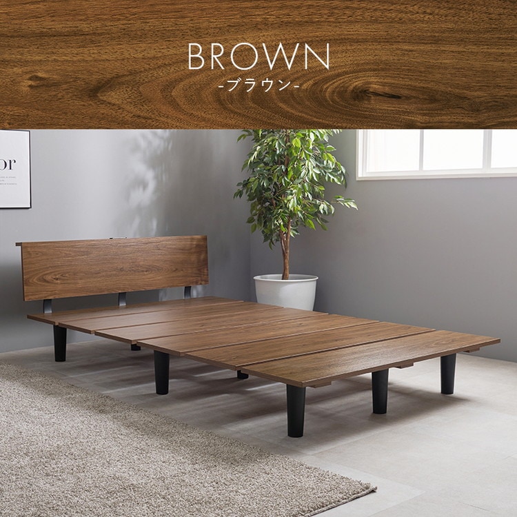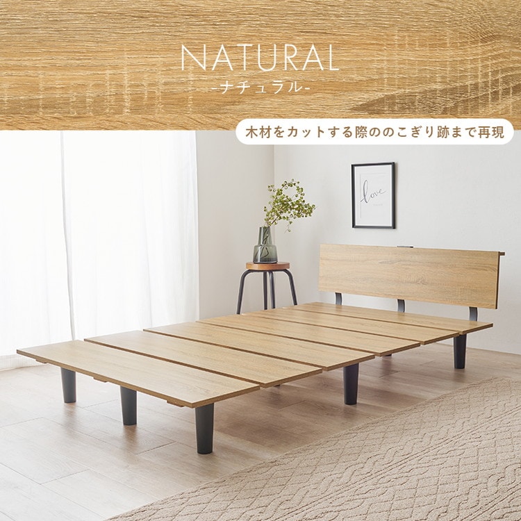 シンプルな木目のパネルに黒い脚がスタイリッシュなデザイン性の高いベッド。小さいマットレスと合わせれば、ステージベッドのような使い方も可能です。