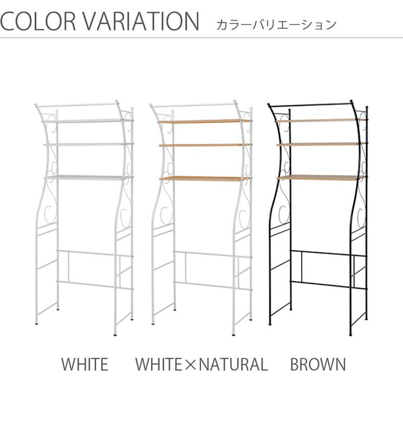 アイアンの曲線がエレガントで、デッドスペースを有効活用できる洗濯機ラック。