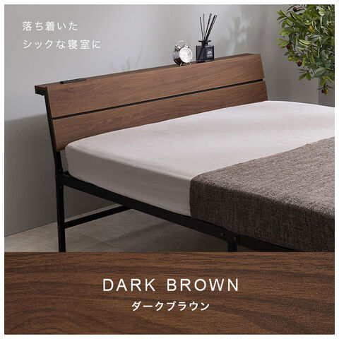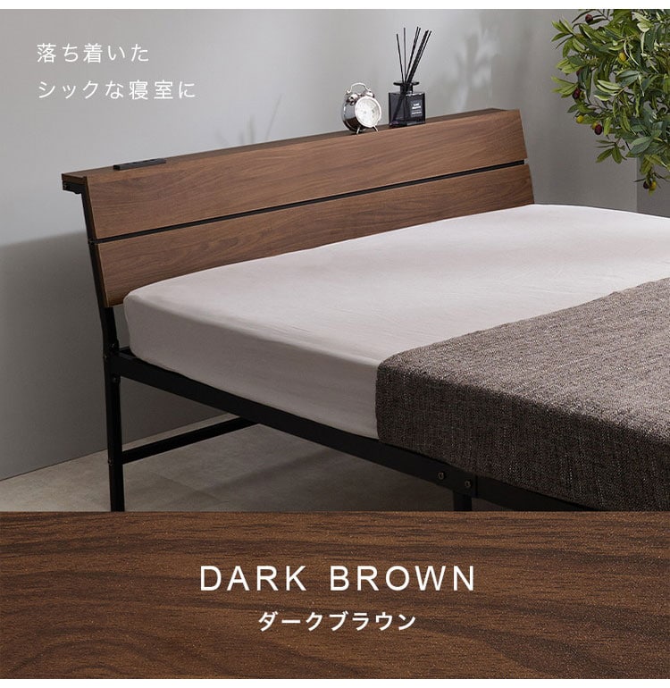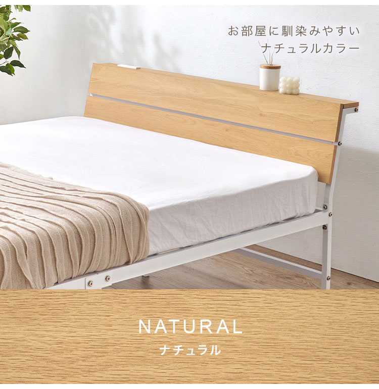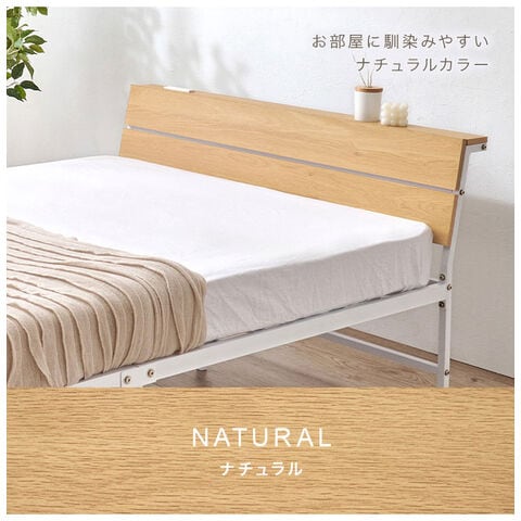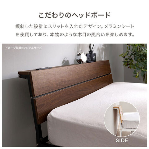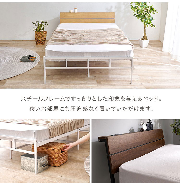 スチールフレームでスッキリとした印象のセミダブルベッド。ヘッドボードは木目調の傾斜があるパネル仕様です。便利な2口コンセント付き