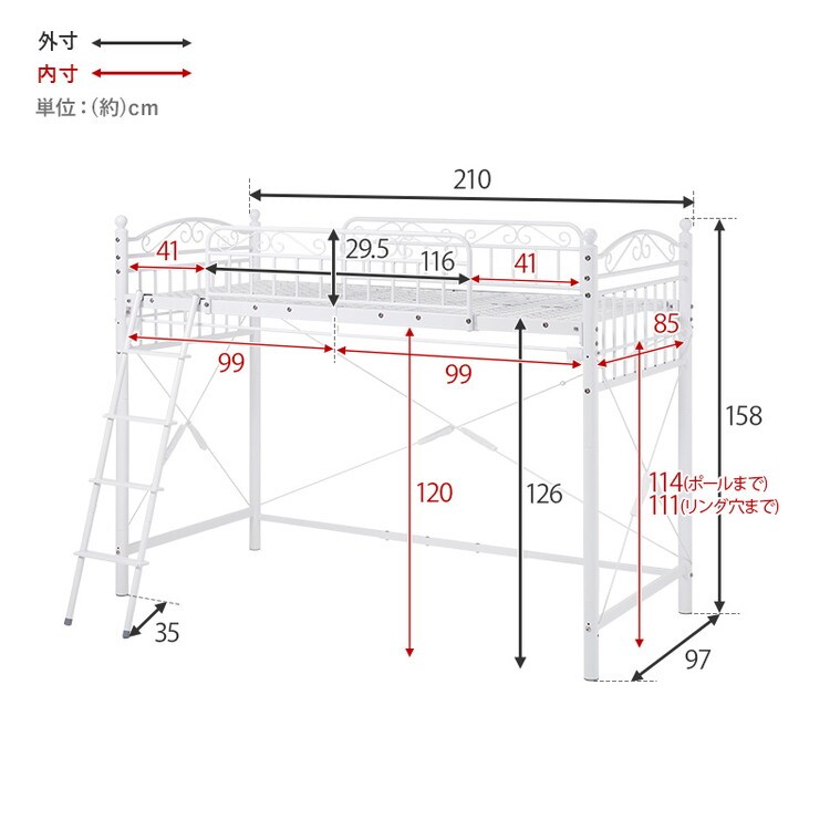 姫系 ロフトベッド シングル 高さ158cm ミドルタイプ プリンセスベッド プリンセスロフトベッド カーテン取付可能 白 ホワイト 可愛い かわいい 北欧 おしゃれ【送料無料】のレビュー