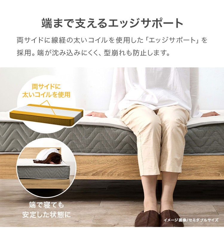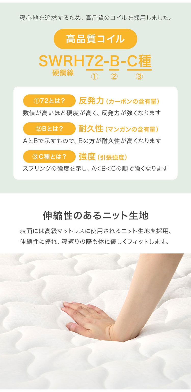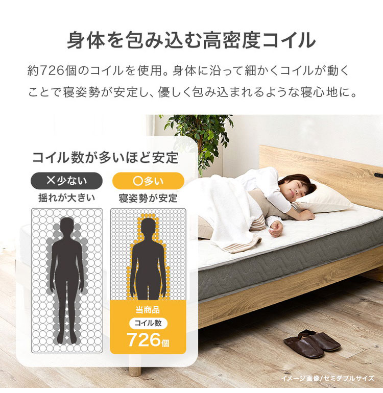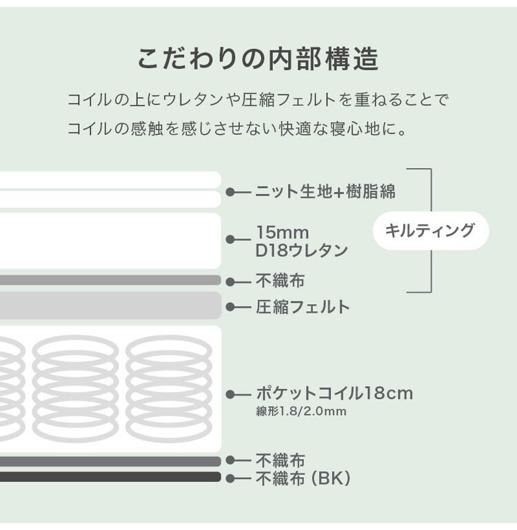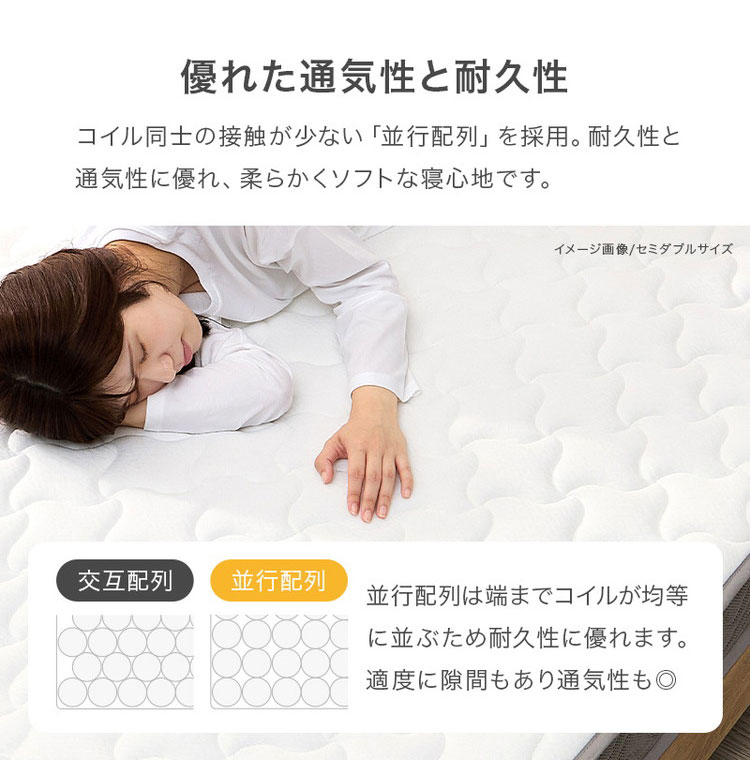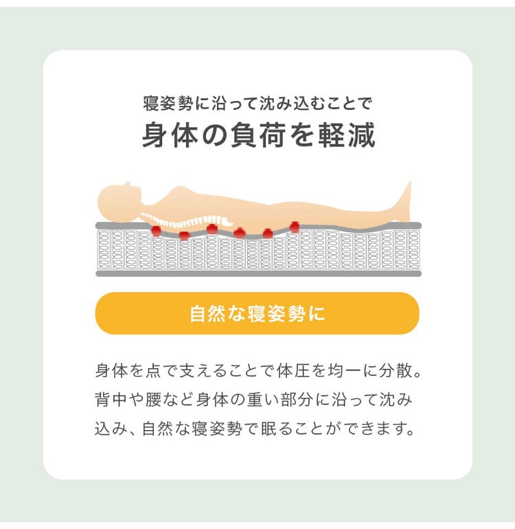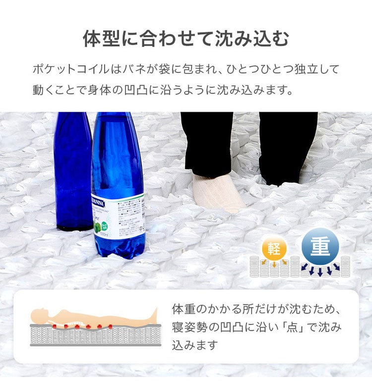 体型に沿うように点で支え、体圧を分散するポケットコイルマットレス。圧縮ロールタイプ。ダブルサイズ