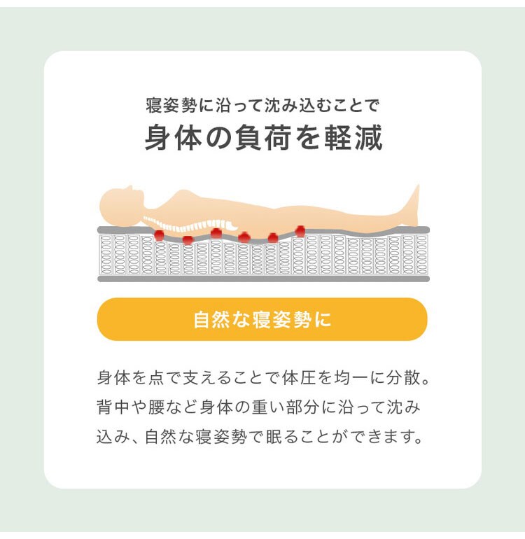体型に沿うように点で支え、体圧を分散するポケットコイルマットレス。圧縮ロールタイプ。セミダブルサイズ