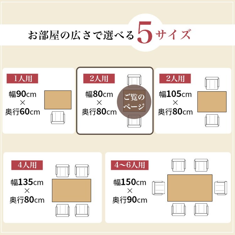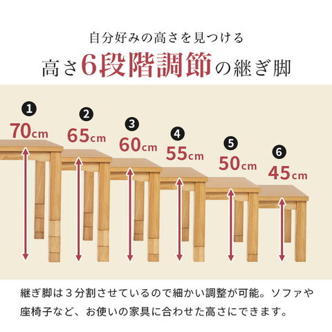 高さが6段階に変更できるこたつテーブル。ダイニングチェア、ソファ、座椅子などお使いの家具に合わせた高さに変更できます。