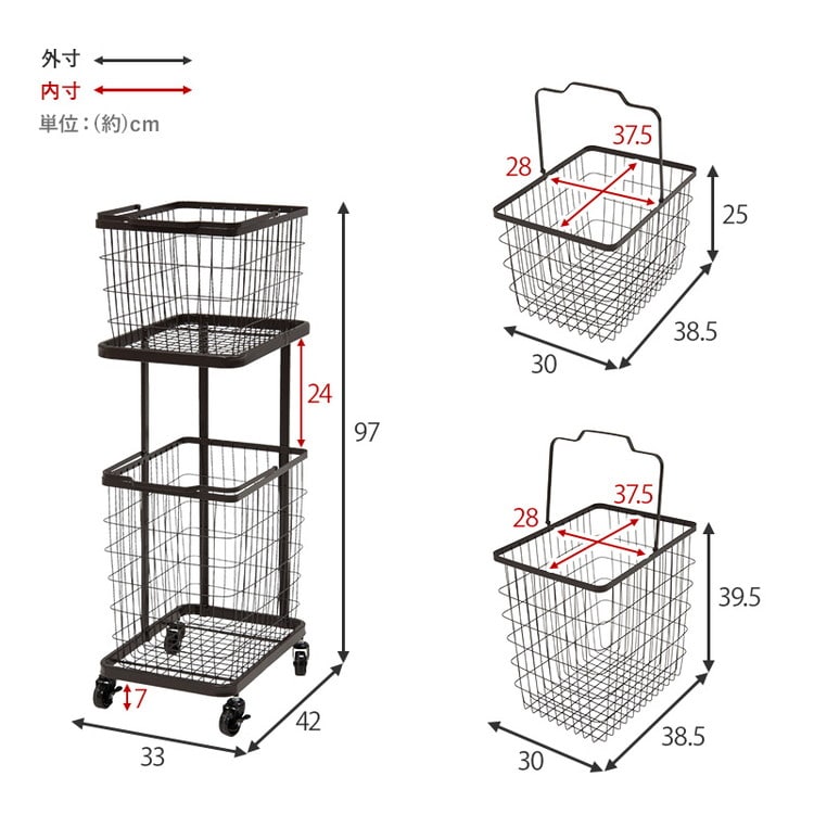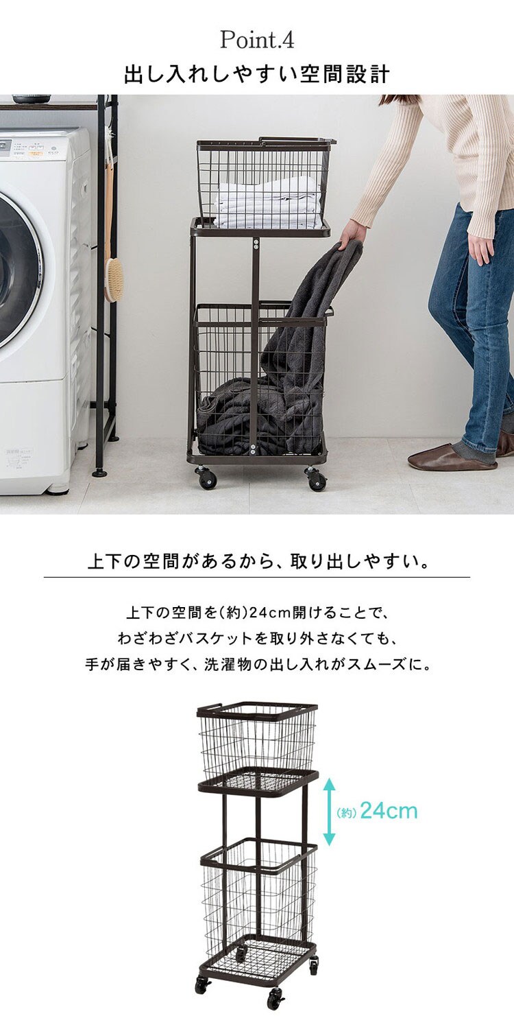 色柄物や汚れた洗濯物を分けて溜められるランドリーワゴン。バスケットは持ち運べて便利。
