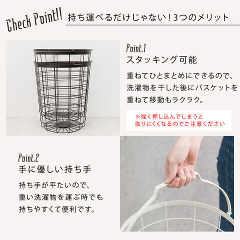 バスケットはスタッキング可能。重ねてひとまとめにできるので、洗濯物を干した後にバスケットを重ねて移動もラクラク。