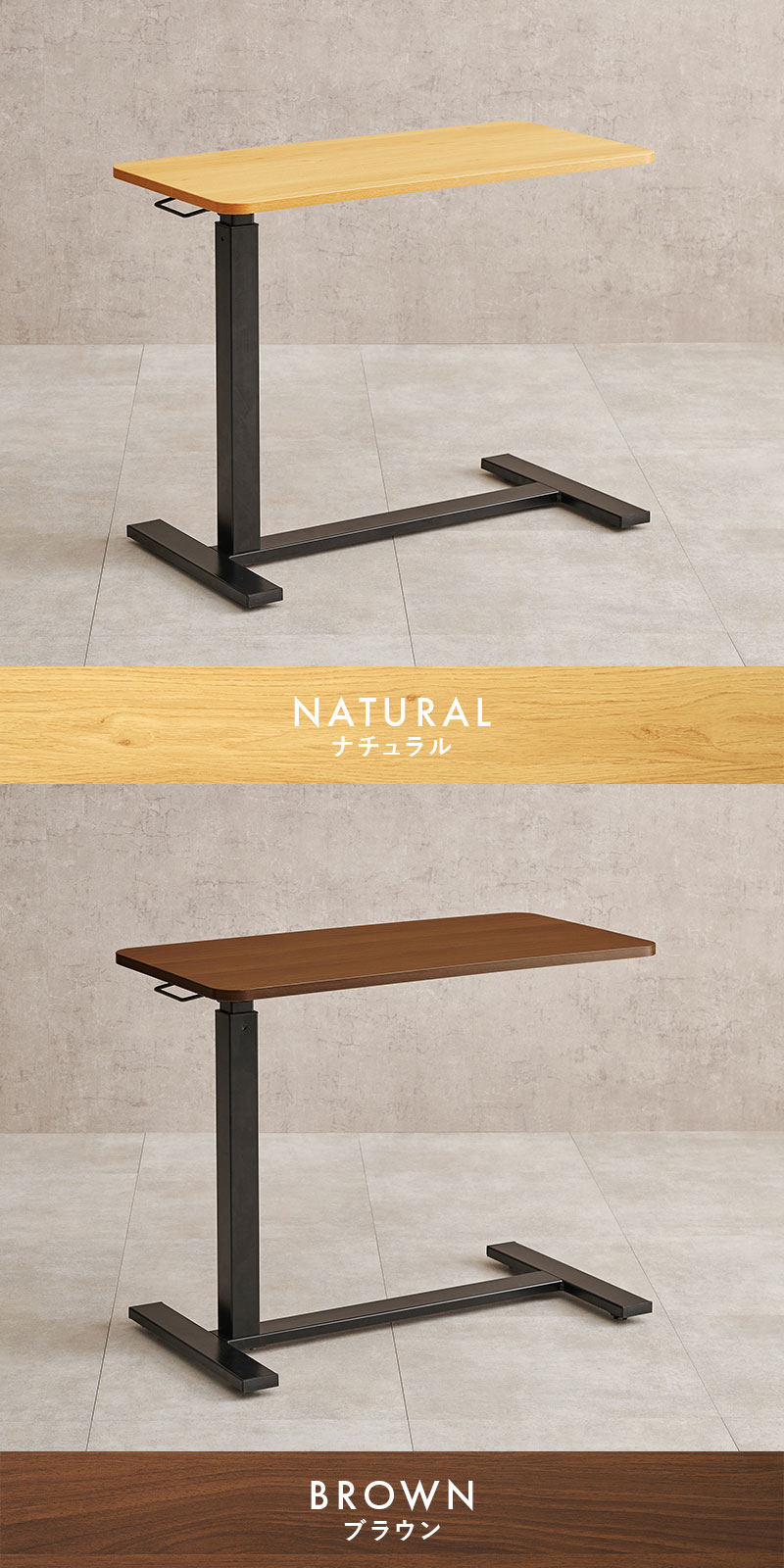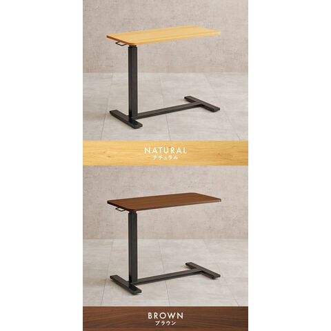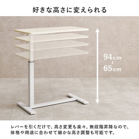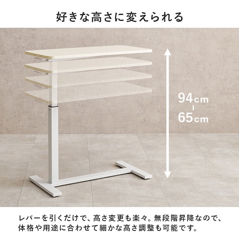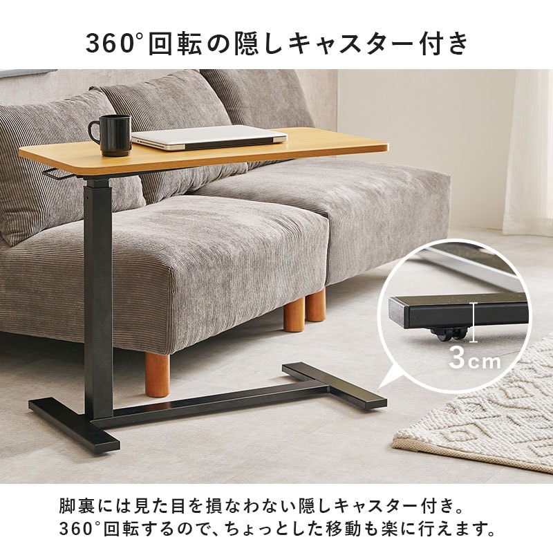 ガス圧式で無段階に高さ調節ができる昇降テーブル。キャスター付きで移動がしやすく、ソファやベッドに座って作業するときも脚が邪魔にならないデザインです。
