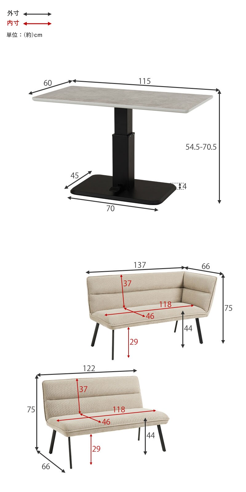 テーブル:(約)幅115×奥行60×高さ54.5~70.5cm