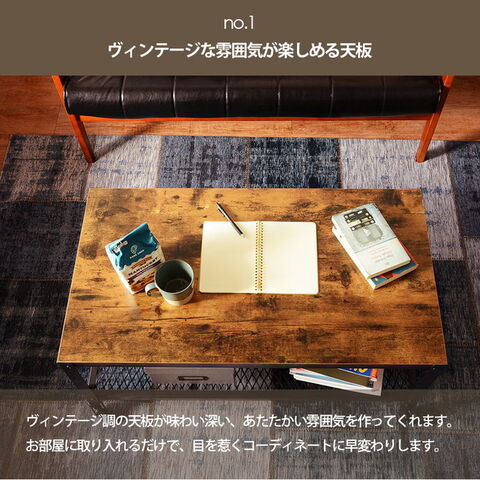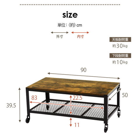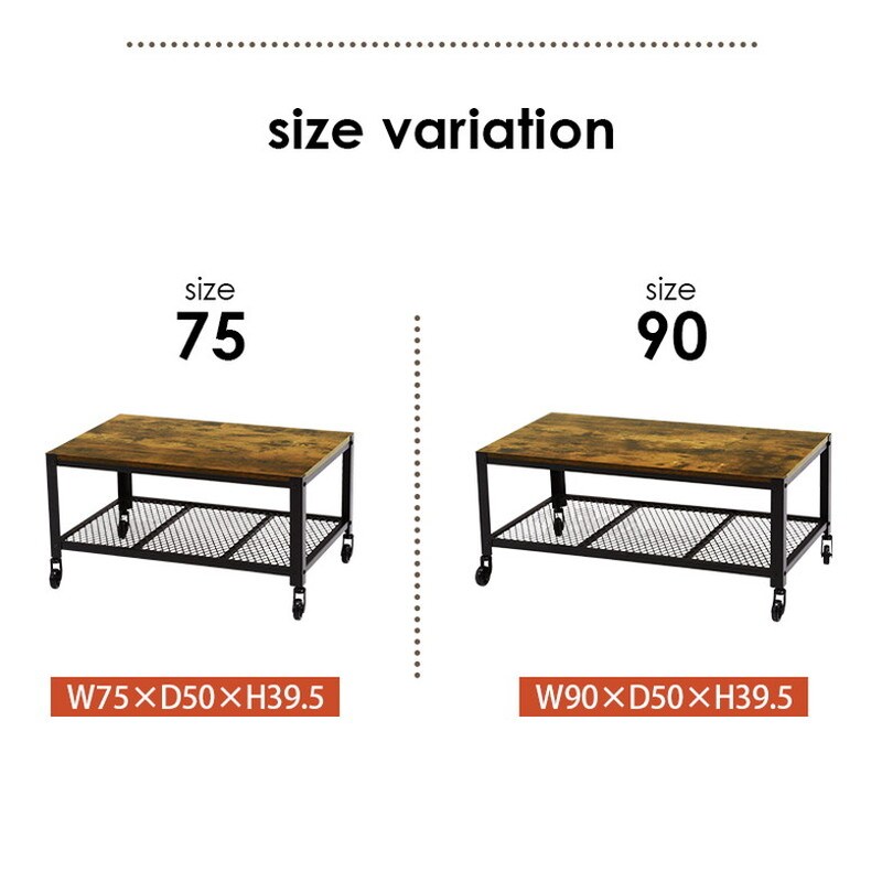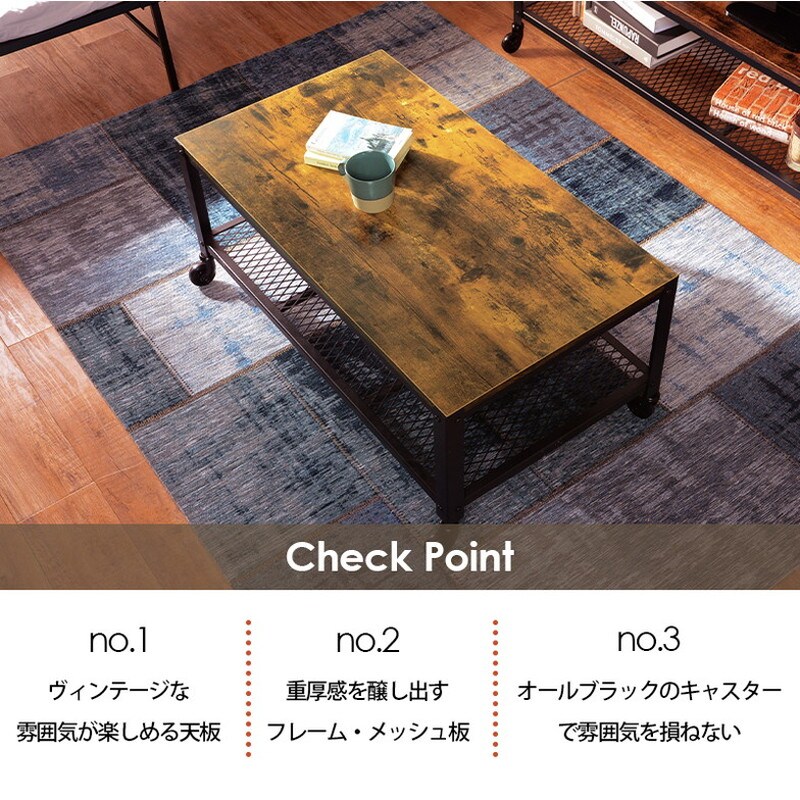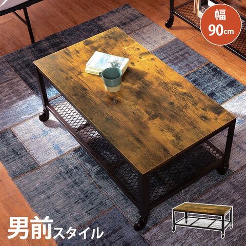 ヴィンテージ調 センターテーブル ローテーブル 幅90 リビングテーブル コーヒーテーブル カフェテーブル 棚付き 収納棚 キャスター付 インダストリアル スチール おしゃれ ブラウン ブラック 黒【送料無料】