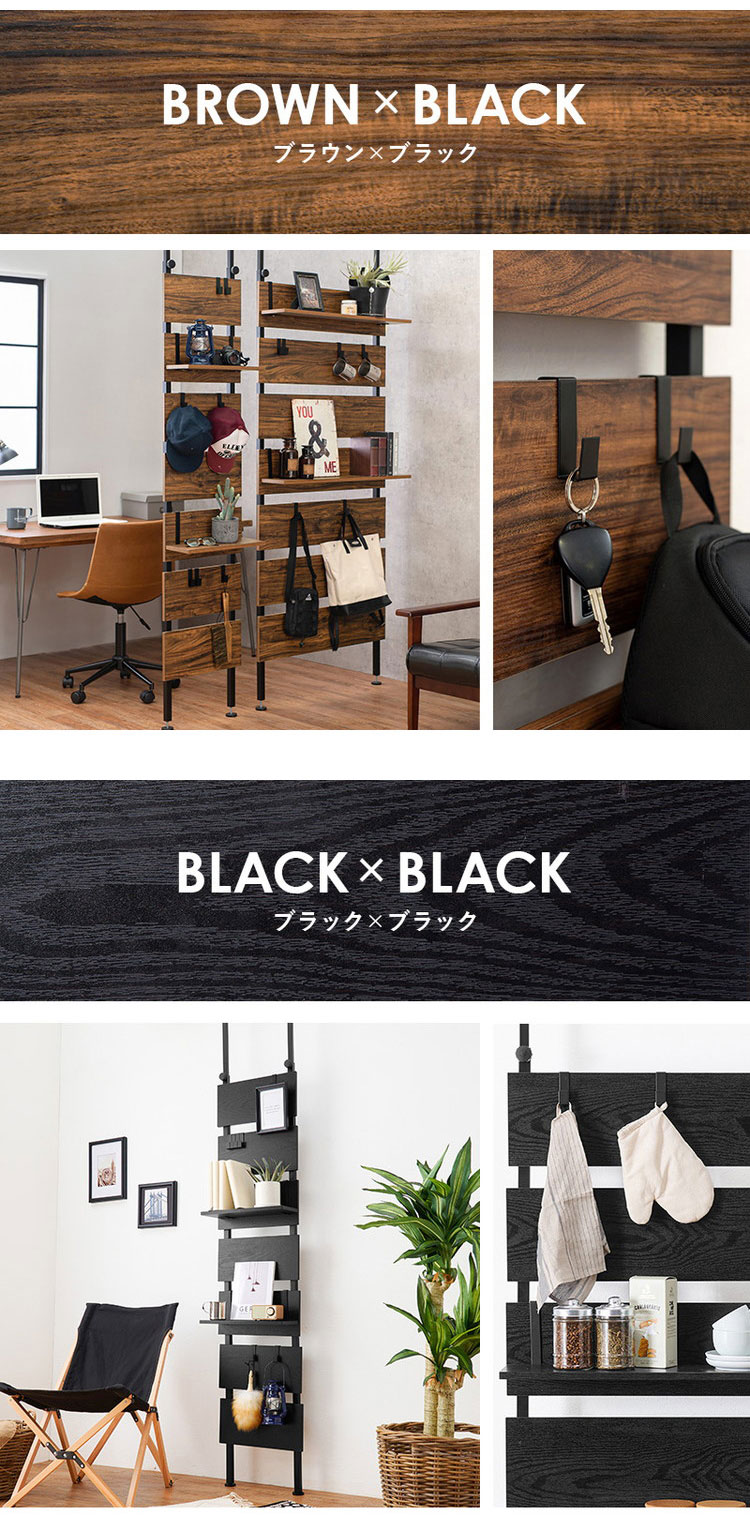 お部屋のいろいろな場所に設置できる突っ張り式ラック。パーテーションや間仕切りとしても活躍します。