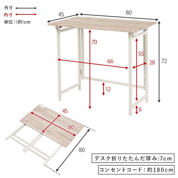 デスク:幅80×奥行45×高さ72cm(折りたたんだ状態の高さ:80cm)