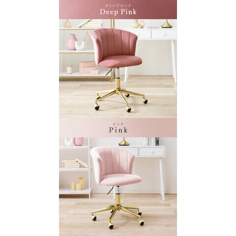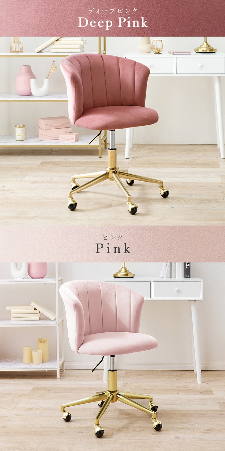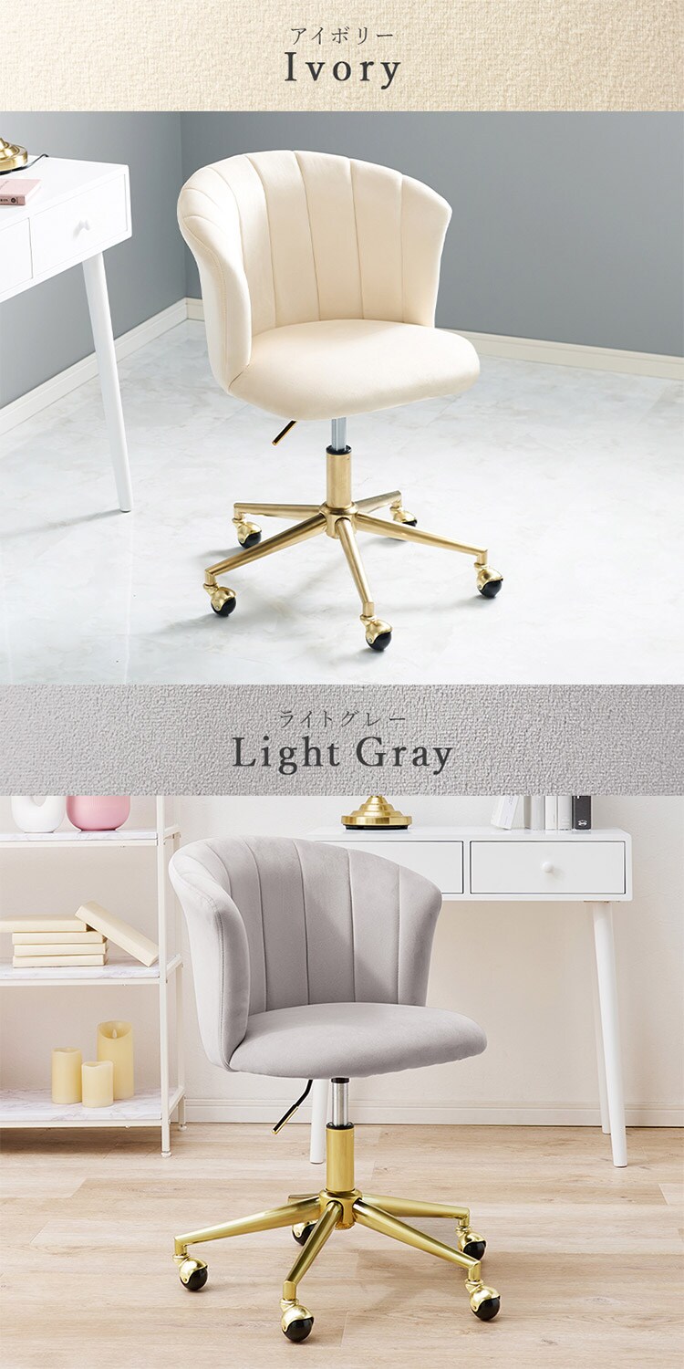 上品さを感じるゴールドの脚にベロア調生地の大人可愛い回転チェアです。キャスター付き