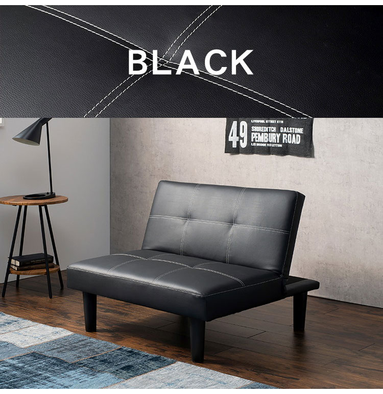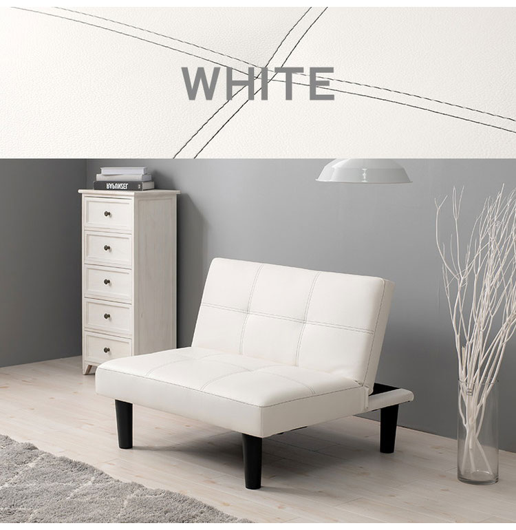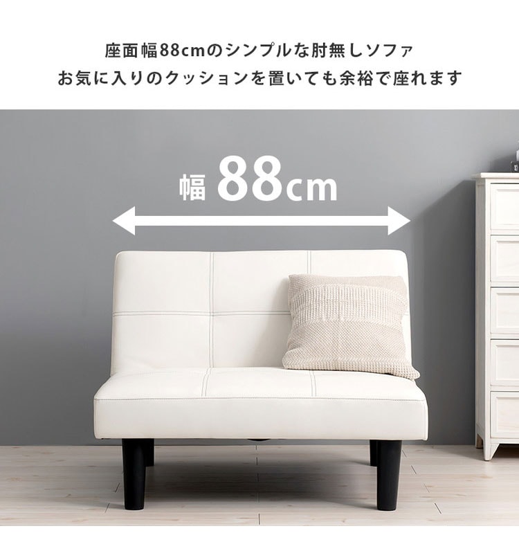 シンプルなデザインの肘なしソファ。高さを抑えた設計で圧迫感を感じにくくなっています。背もたれ3段階リクライニング仕様