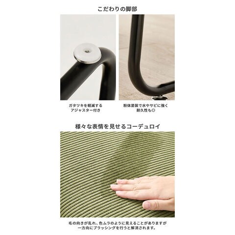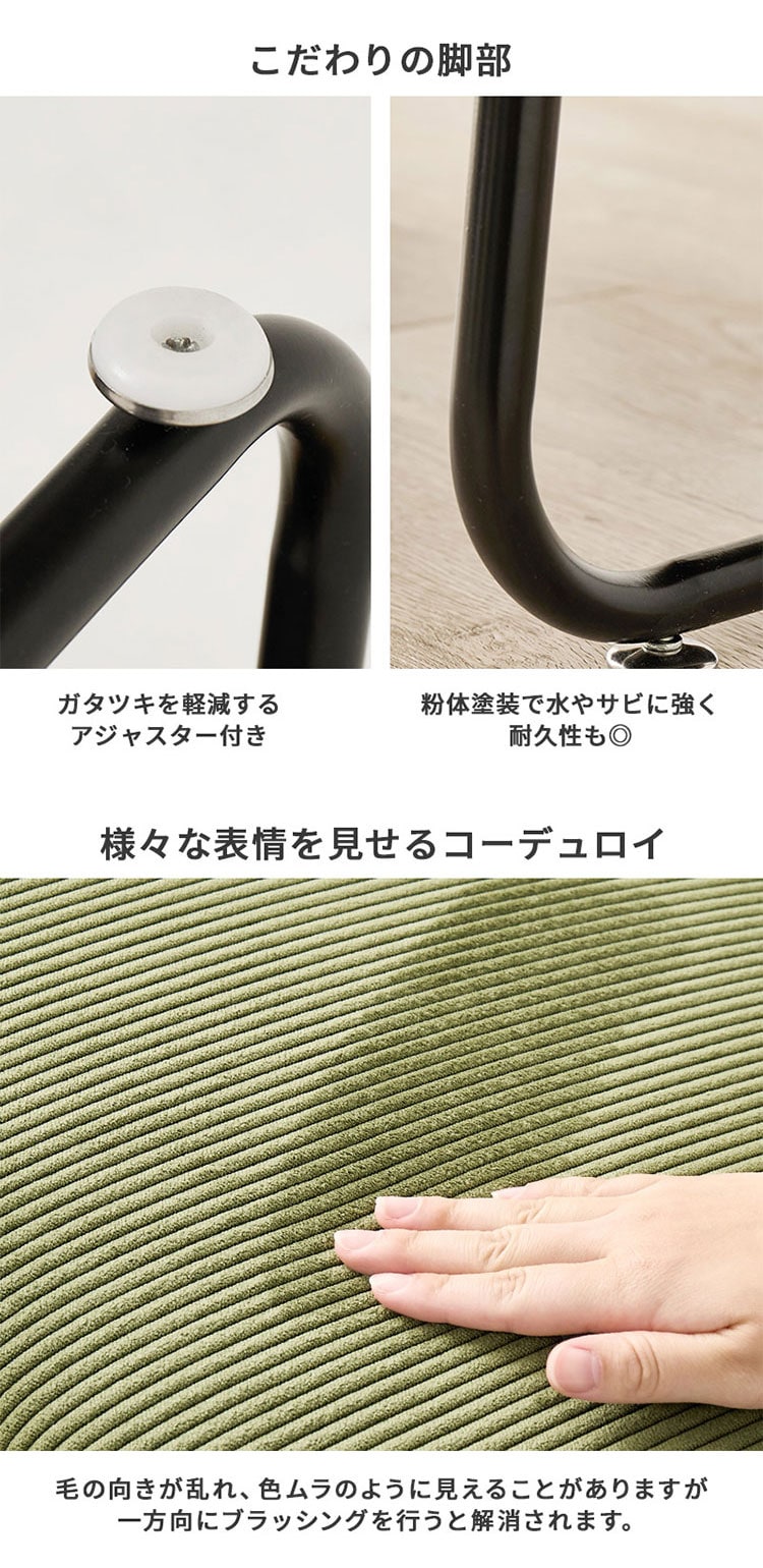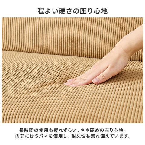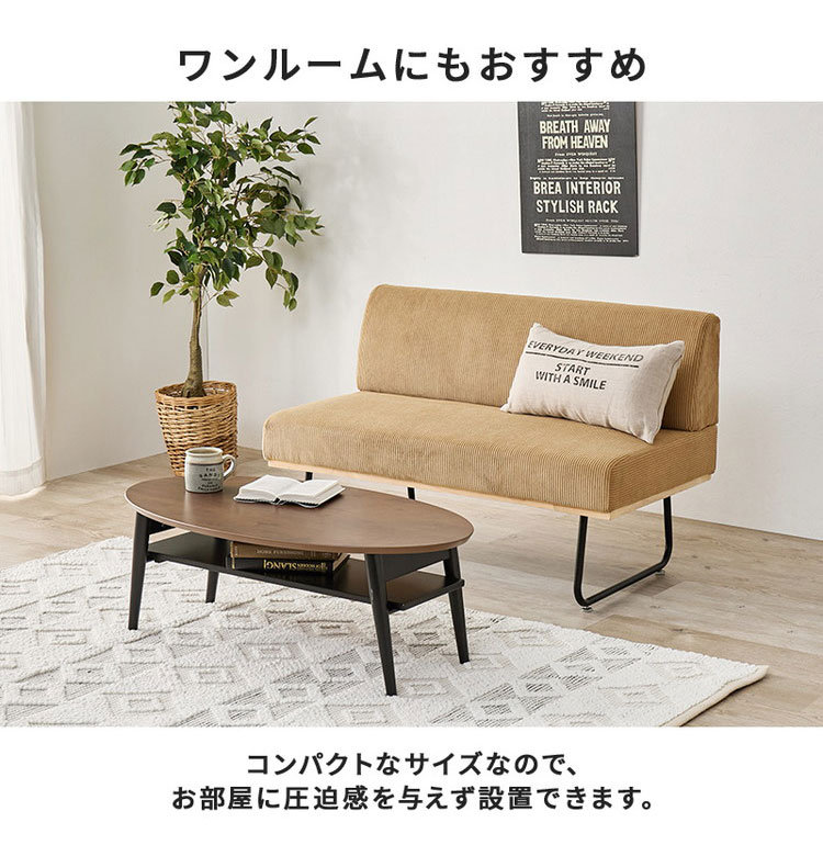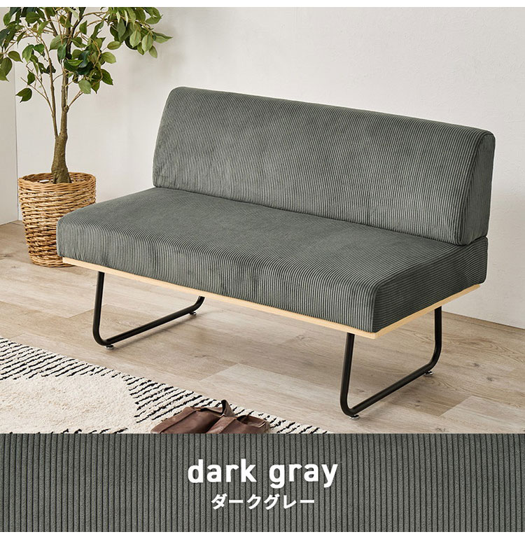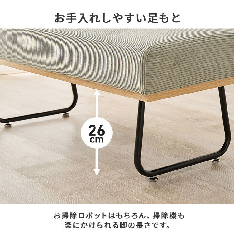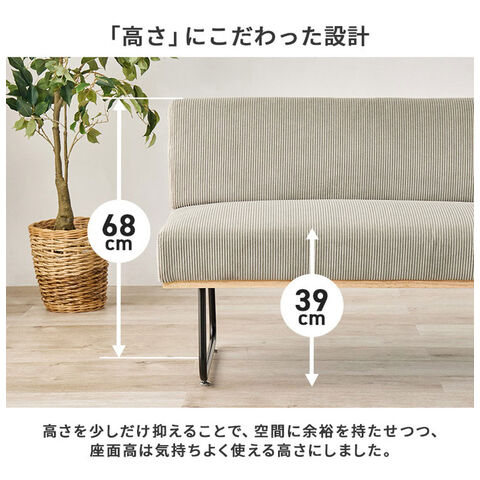 お部屋のアクセントになるコーデュロイ生地を使用。肘が無いのでコンパクトタイプだけど座面は広々。ダイニングソファやワンルームのソファとしてもおすすめ。