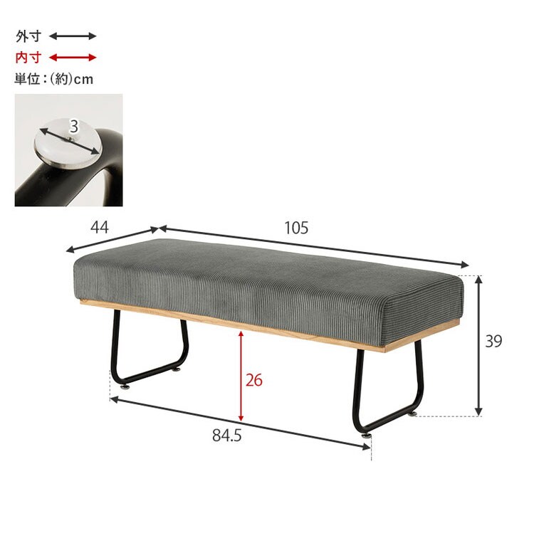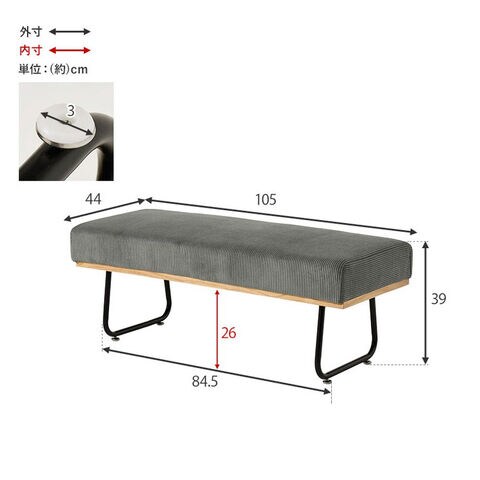 ダイニングベンチ 2人掛け 幅105cm コーデュロイ ゆったりベンチ スチール脚 おしゃれ ダイニングチェア 椅子 イス インダストリアル【送料無料】のレビュー