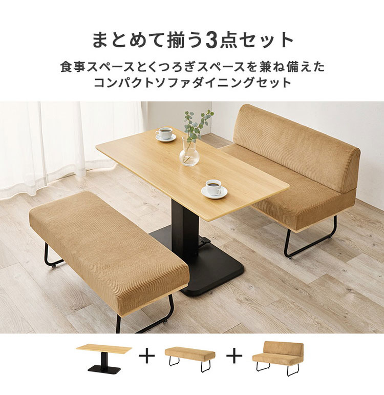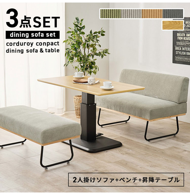 ダイニング3点セット 昇降テーブル+ソファ+ベンチ 幅115cm ダイニングテーブルセット ソファダイニング ダイニングセット コーデュロイ おしゃれ【送料無料】