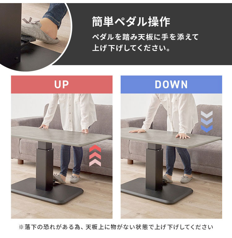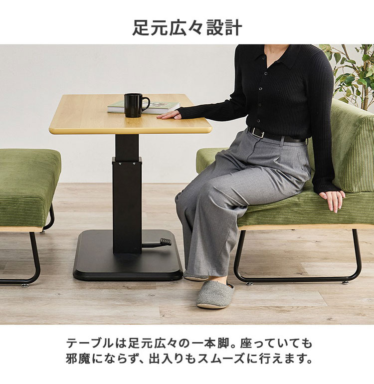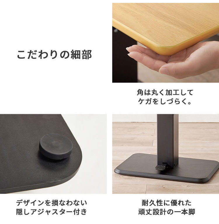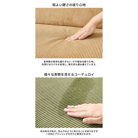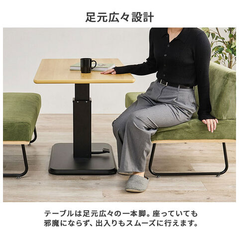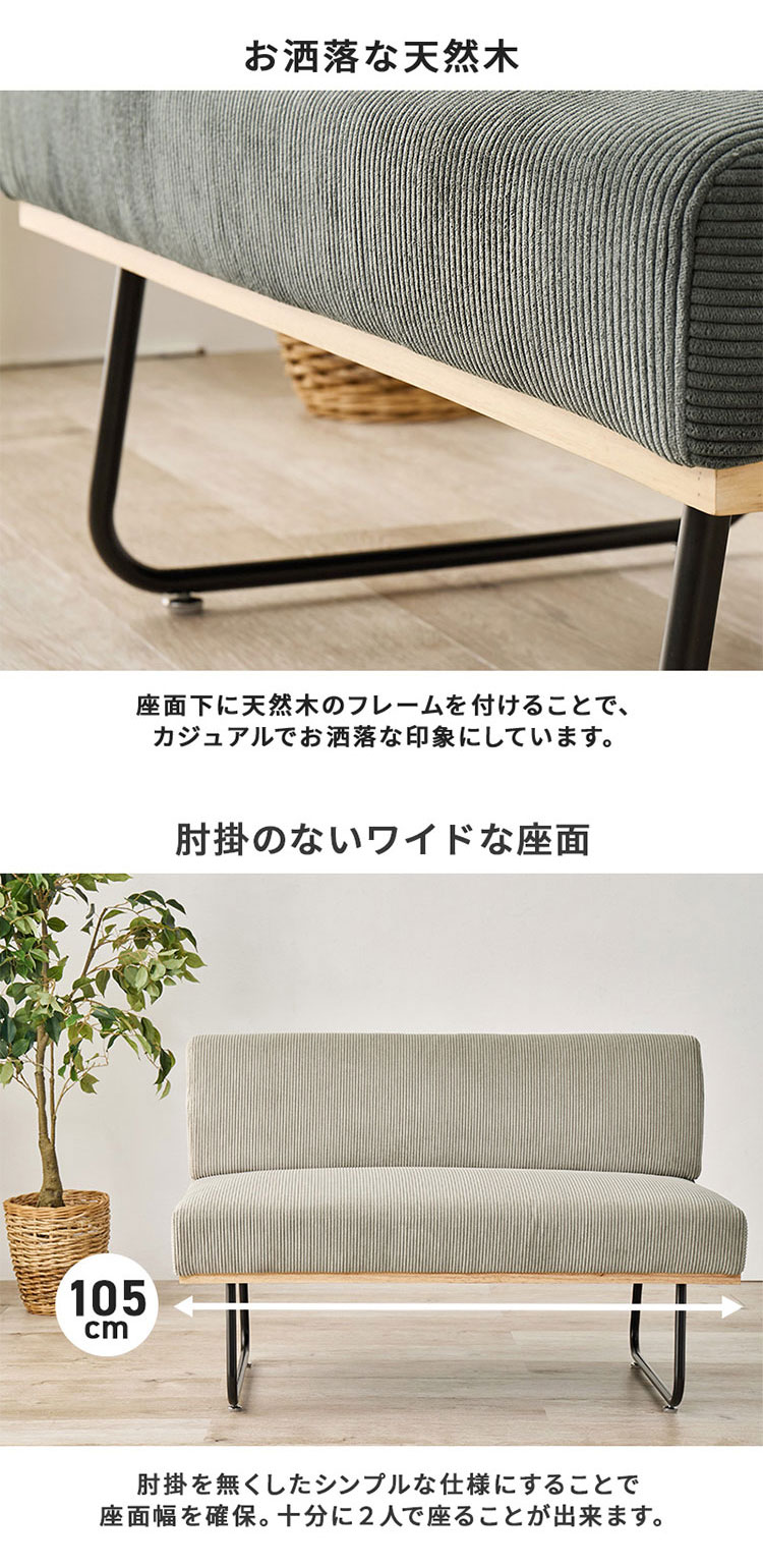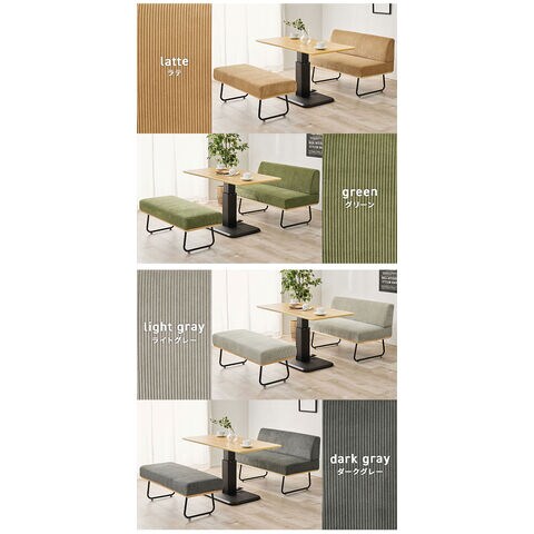 コーデュロイ生地のおしゃれなソファを合わせたダイニングセット。座面はやや低めで圧迫感を与えづらく、テーブルの天板は体格に合わせて無段階に昇降できます。