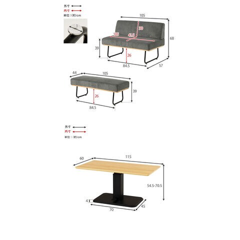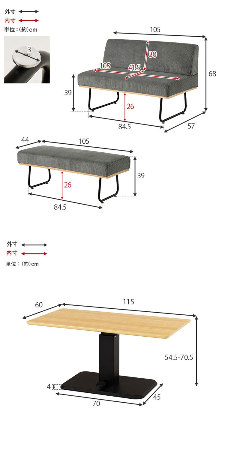 テーブル:(約)幅115×奥行60×高さ54.5~70.5cm、ソファ:(約)幅105×奥行57×高さ68×座面高39cm、ベンチ:(約)幅105×奥行44×高さ39×座面高39cm