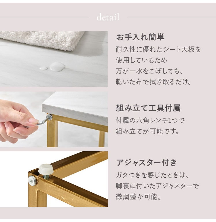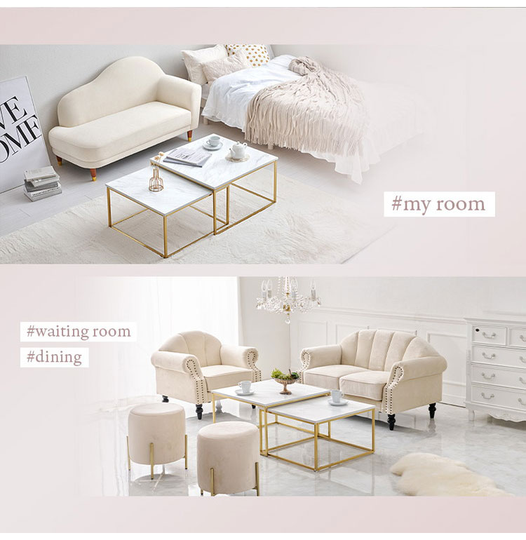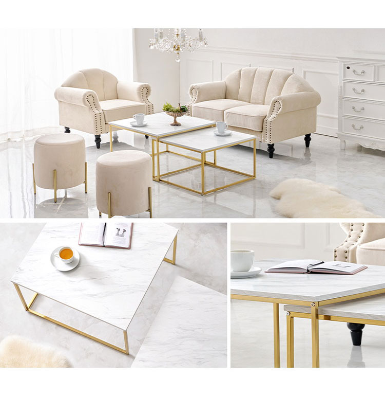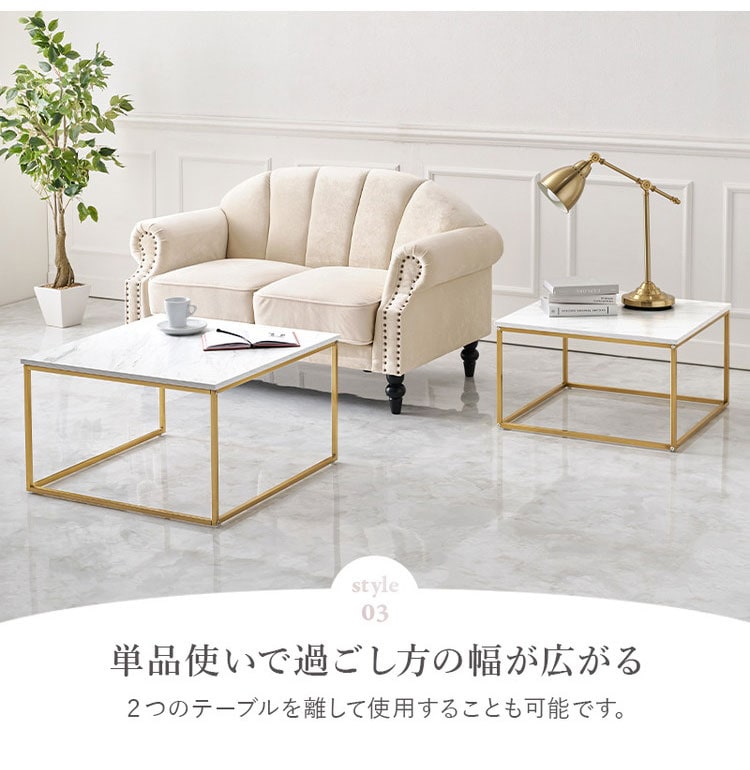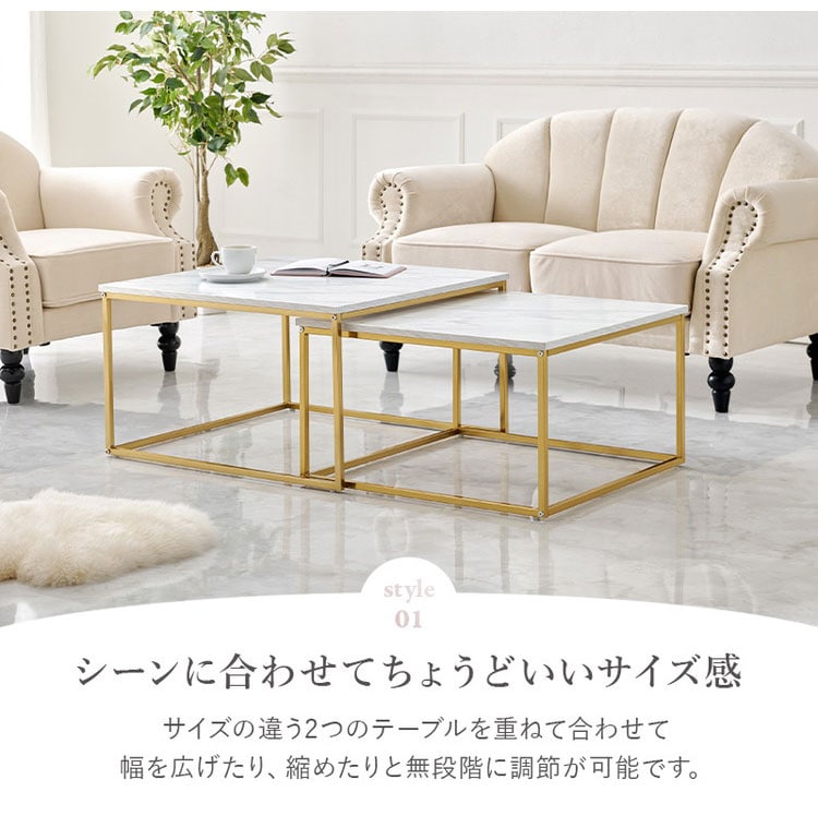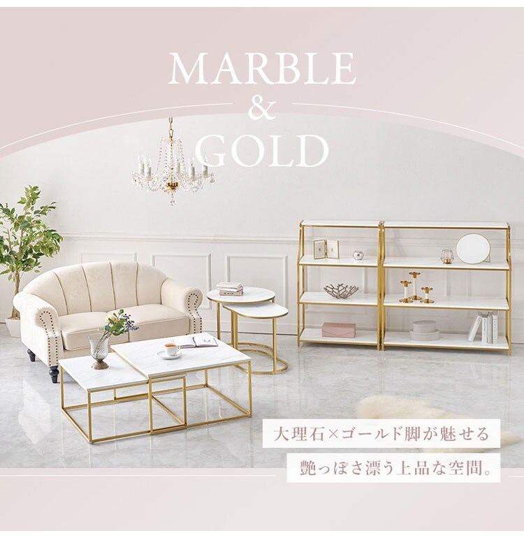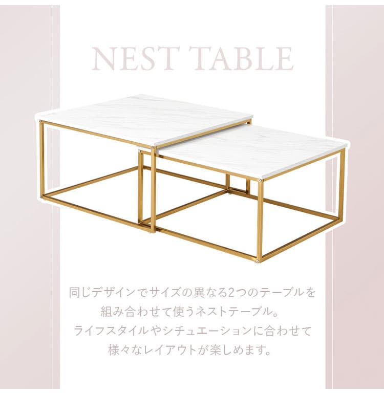 お部屋を華やかに彩る、エレガントな大理石調の天板とゴールドのフレームが特徴のネストテーブル。シチュエーションに合わせて様々なレイアウトが楽しめます。