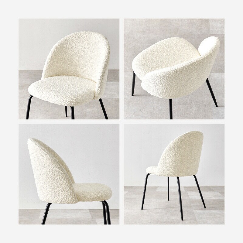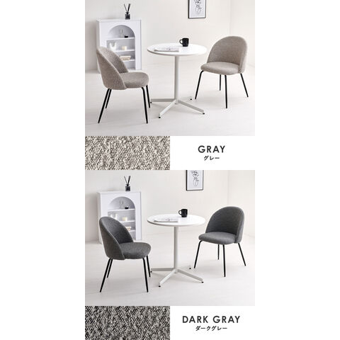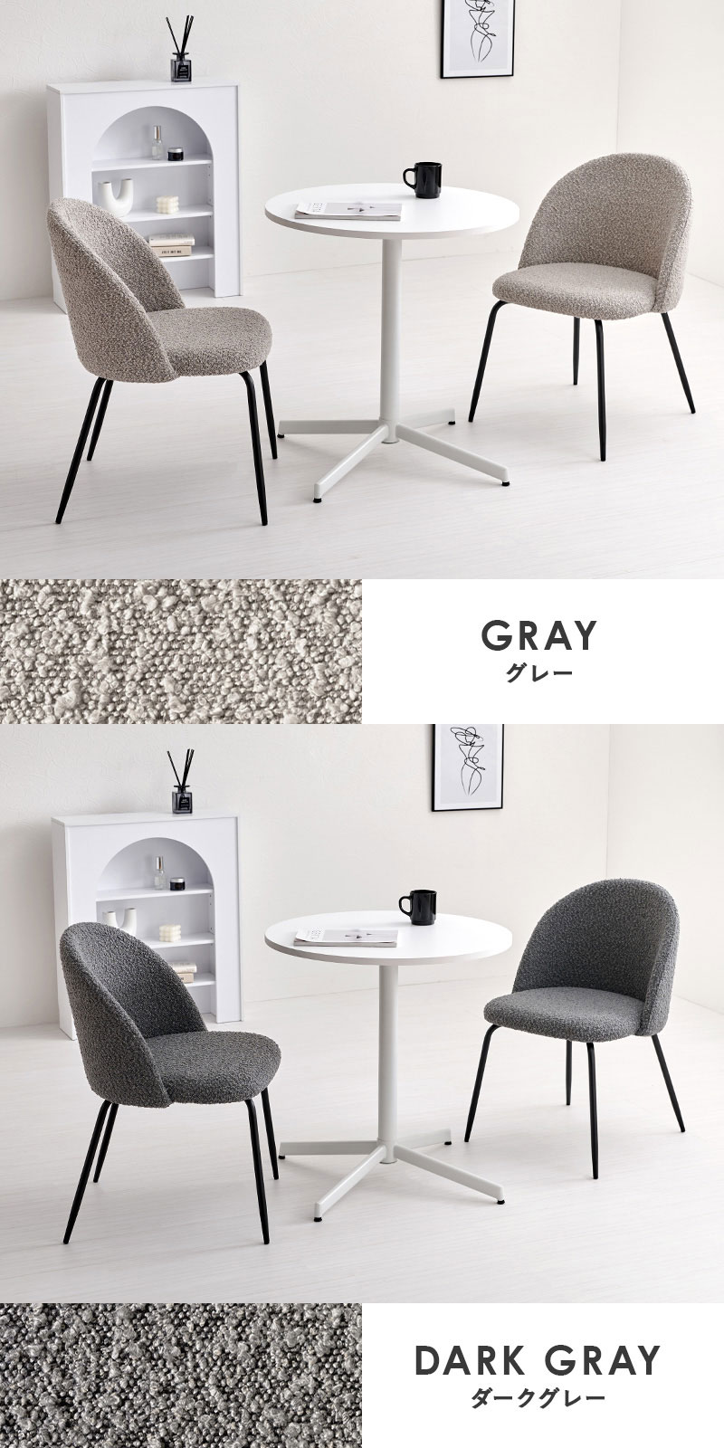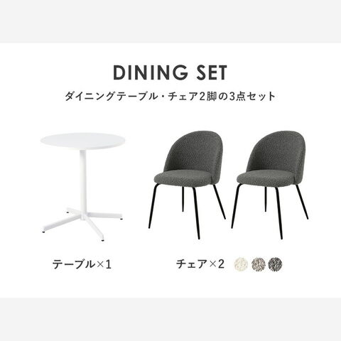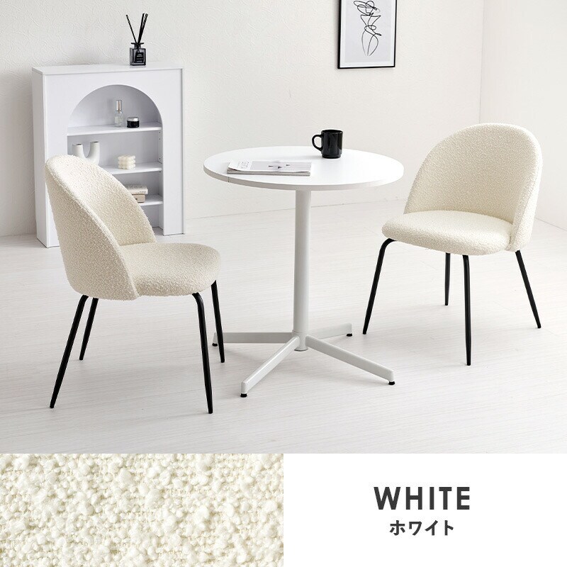 ぽこぽことした質感が特徴的なブークレ生地のチェアとホワイトカフェテーブルを合わせた、モダンでありながら温かみのある雰囲気の3点セット。
