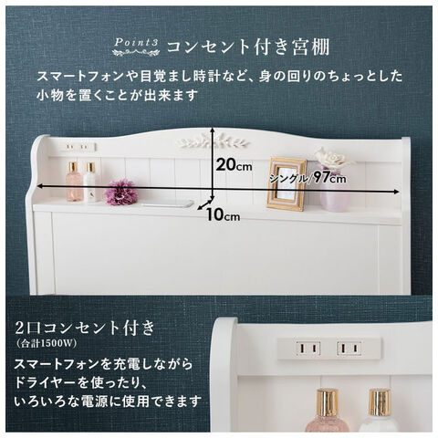 姫系 引出し収納付き ベッド シングル ホワイト 白 エレガント 収納付き チェストベッド 棚付き 宮棚 2口コンセント ベッドフレーム すのこベッド【送料無料】