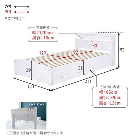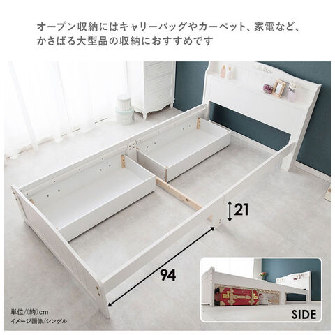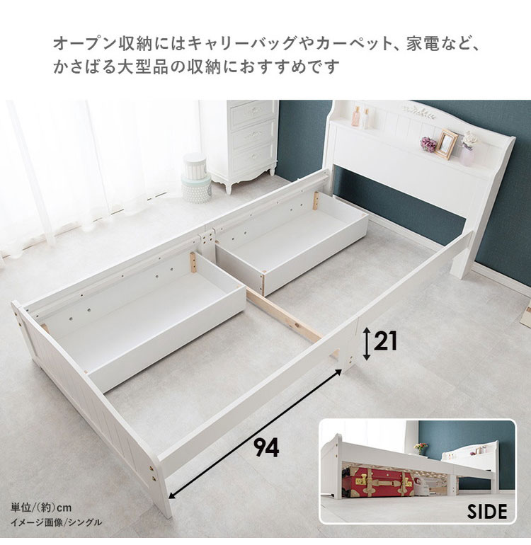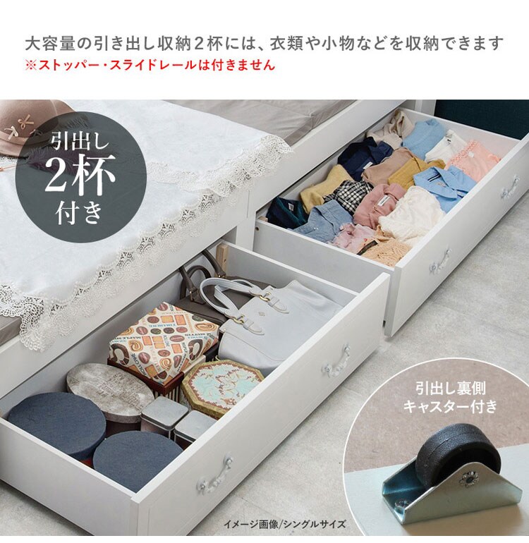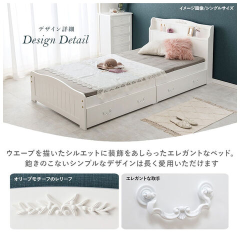 姫系 引出し収納付き ベッド セミダブル ホワイト 白 エレガント 収納付き チェストベッド 棚付き 宮棚 2口コンセント ベッドフレーム すのこベッド【送料無料】