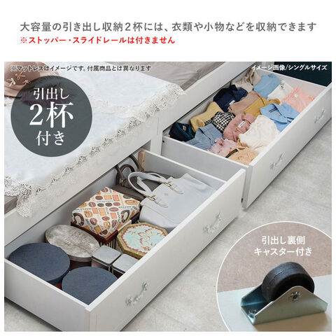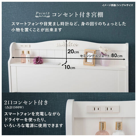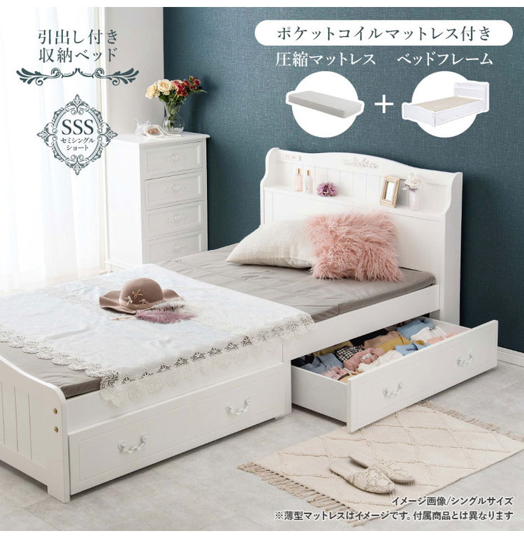 姫系 引出し収納付き ベッド ポケットコイルマットレス付き 2点セット セミシングルショート ホワイト 白 エレガント 収納付き チェストベッド 棚付き 宮棚 2口コンセント すのこベッド【送料無料】