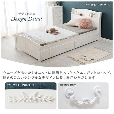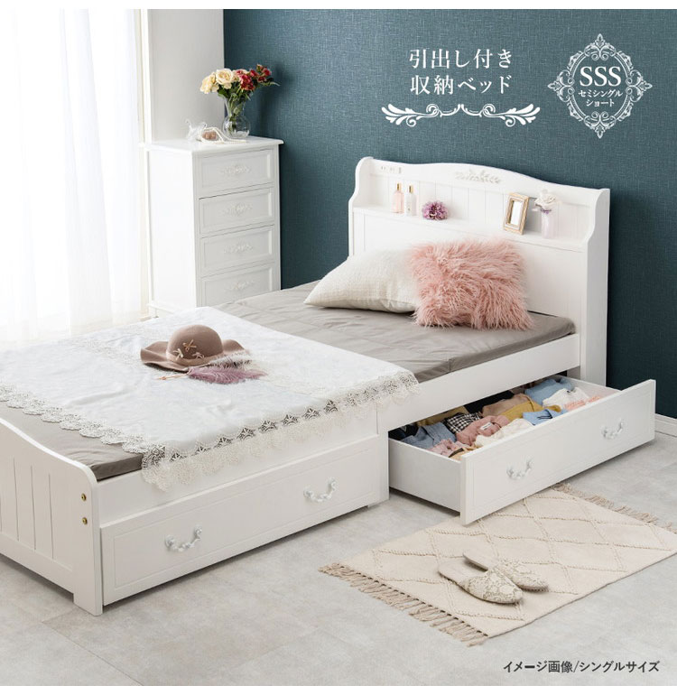 姫系 引出し収納付き ベッド セミシングルショート ホワイト 白 エレガント 収納付き チェストベッド 棚付き 宮棚 2口コンセント ベッドフレーム すのこベッド【送料無料】