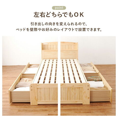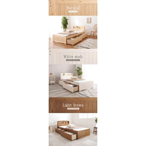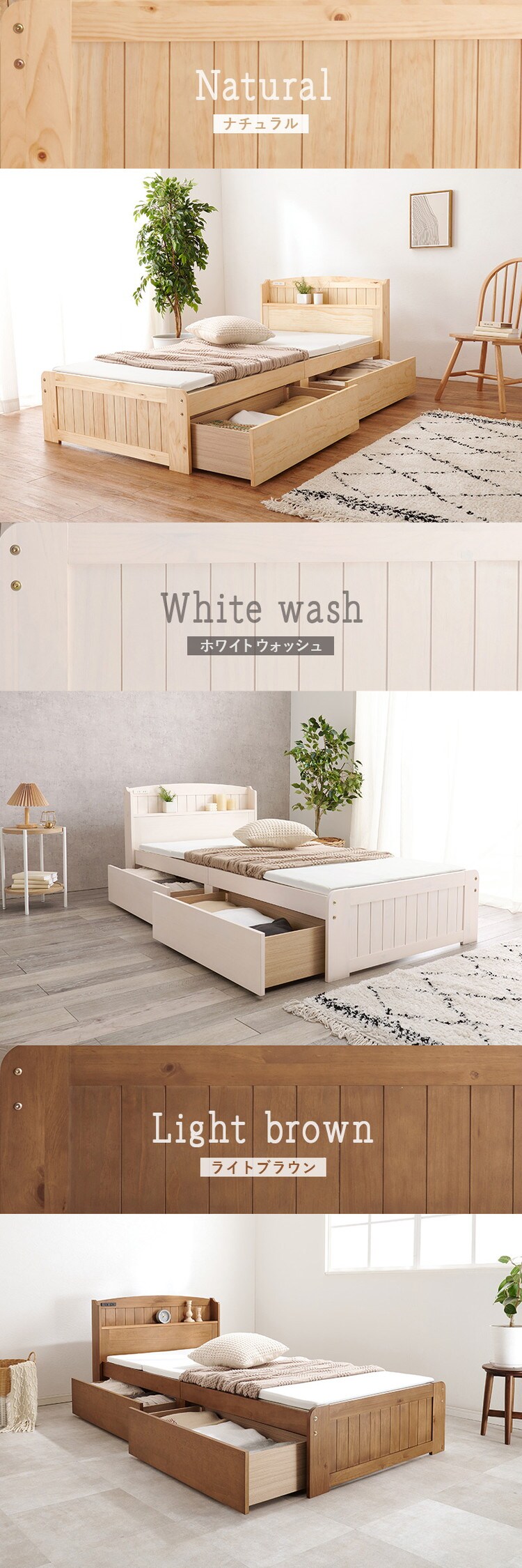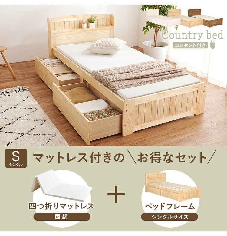 大容量引出し収納付き すのこベッド シングル 4つ折りマットレス 2点セット 宮棚付き ベッド下 収納 カントリー調 チェストベッド ベッドフレーム 天然木 木製 北欧 おしゃれ【送料無料】
