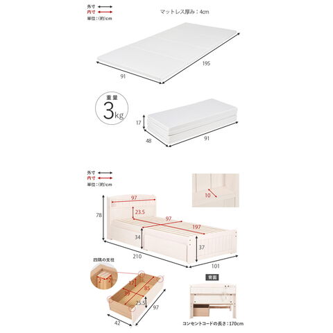 ベッド:(約)幅101×奥行210×高さ78×座面高34cm、マットレス:(約)幅91×奥行195×高さ4cm