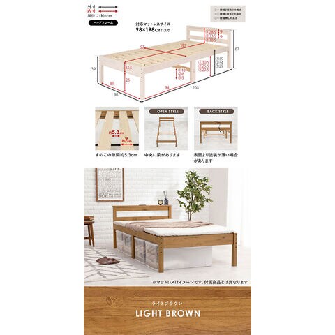 ベッド:(約)幅98×奥行208×高さ67×床面高39/34/29cm、マットレス:(約)幅97×奥行195×高さ20cm