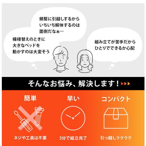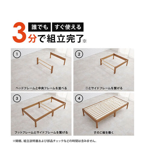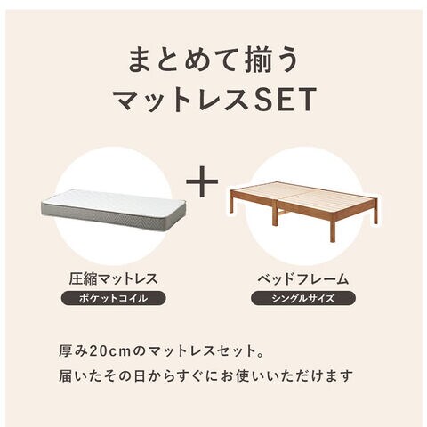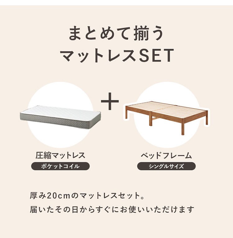 ネジなし、工具不要で簡単組立。シンプルなデザインのシングルベッド。独立したバネが体型に合わせて沈みこむポケットコイルマットレスセット