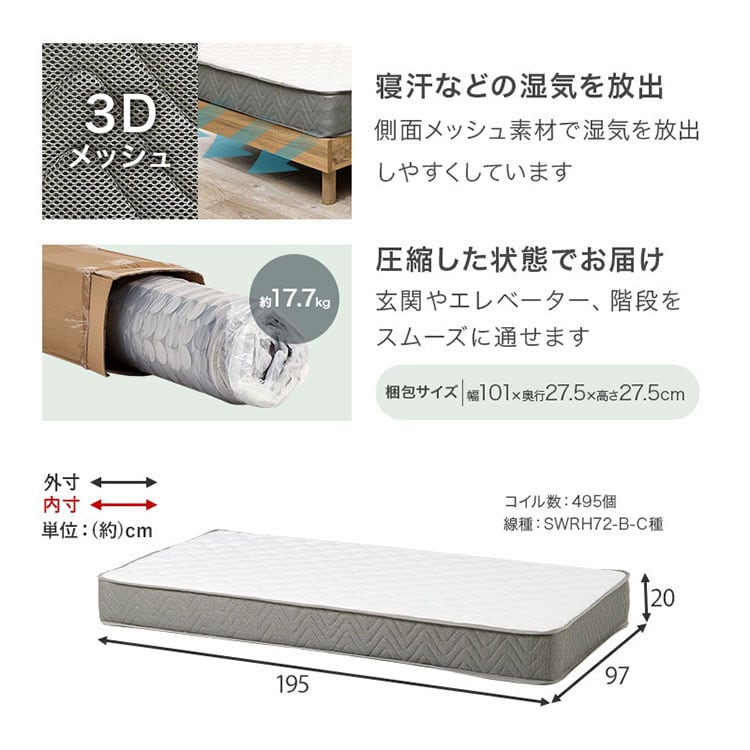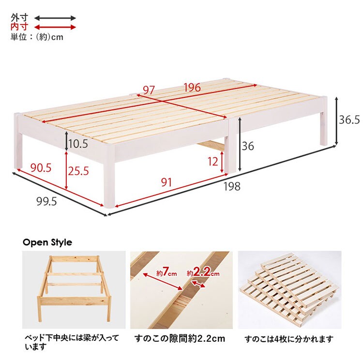 ベッド:(約)幅99.5×奥行198×高さ36.5×座面高36cm、マットレス:(約)幅97×奥行195×高さ20cm