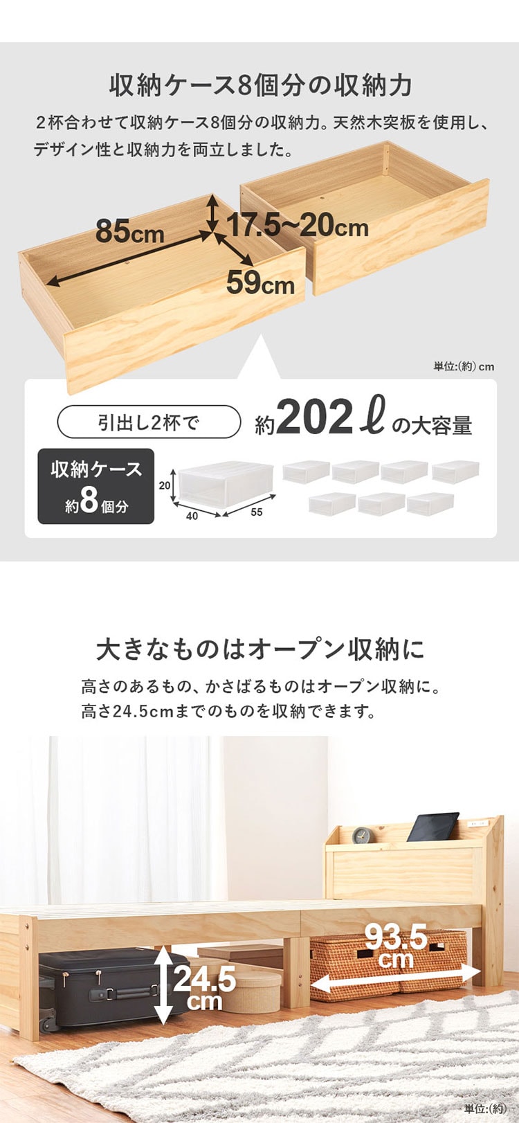 大容量の引出し付きで収納の少ないお部屋にピッタリな頑丈木製すのこベッドです。しっかりとした寝心地のボンネルコイルマットレスセット
