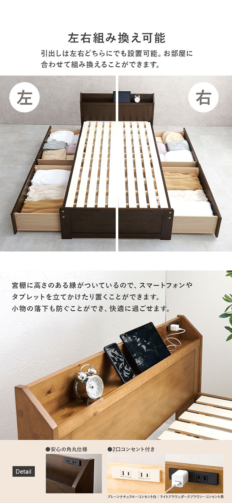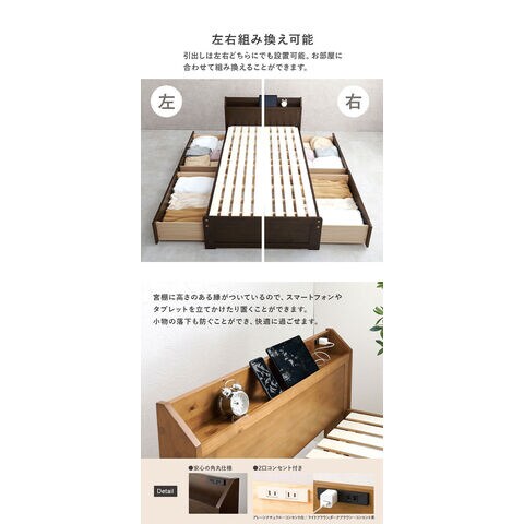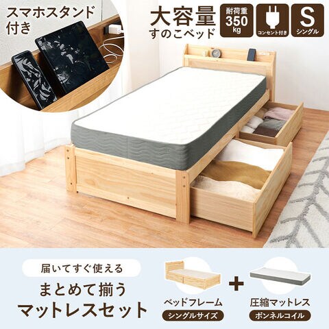 引き出し付き ベッド シングル ボンネルコイルマットレス付き 2点セット 耐荷重350kg 頑丈 チェストベッド 宮棚付き コンセント付き ベッドフレーム すのこベッド 木製 北欧 おしゃれ【送料無料】