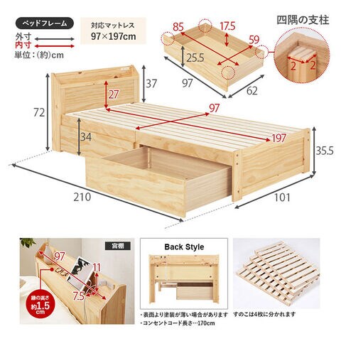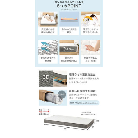 ベッド:(約)幅101×奥行210×高さ72×座面高34cm、マットレス:(約)幅97×奥行195×高さ14.5cm