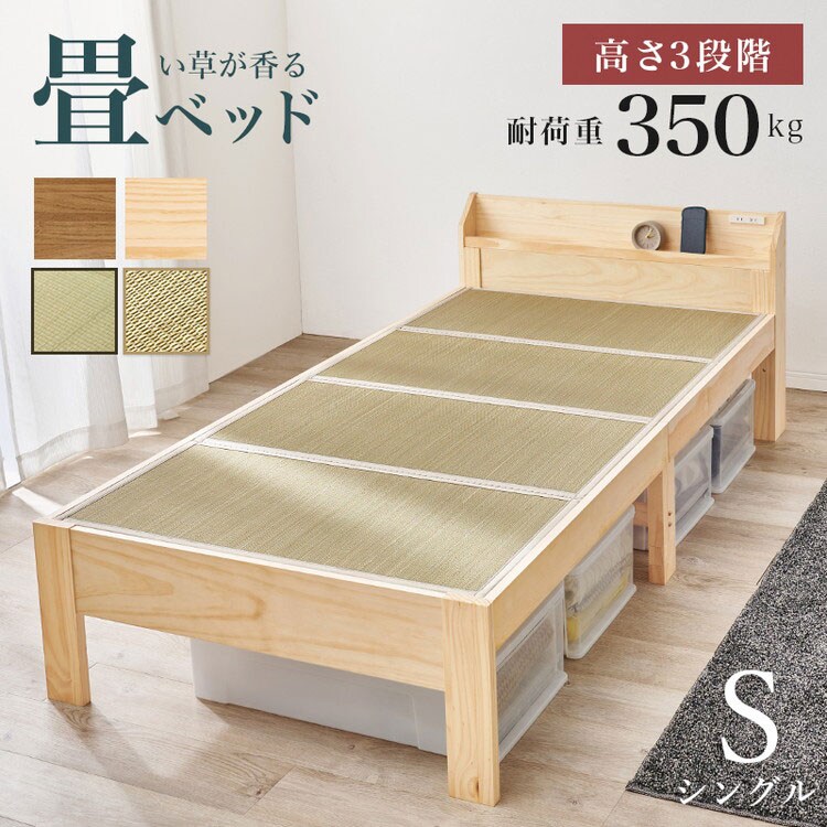 畳ベッド シングル 頑丈 耐荷重350kg 畳マットレス すのこベッド ベッドフレーム 宮棚付き 棚付き 2口コンセント付き い草 木製 和風 和モダン おしゃれ【送料無料】