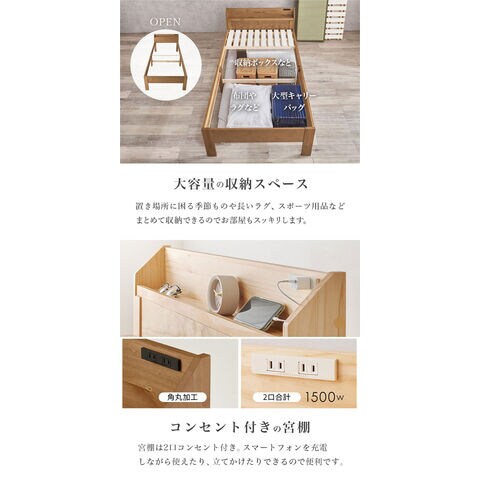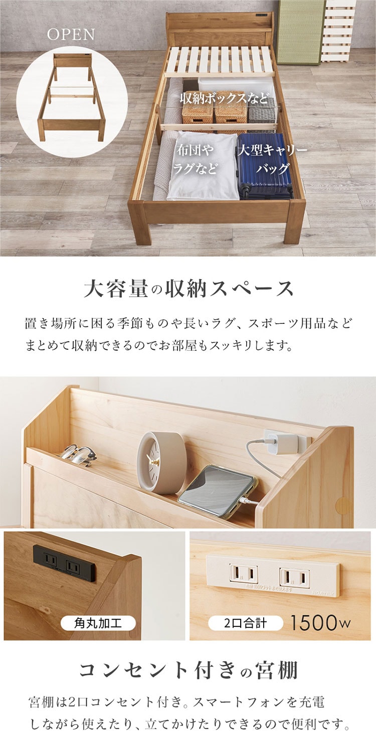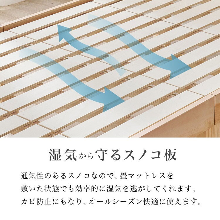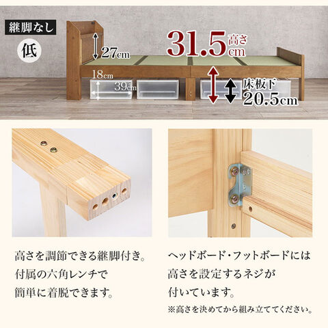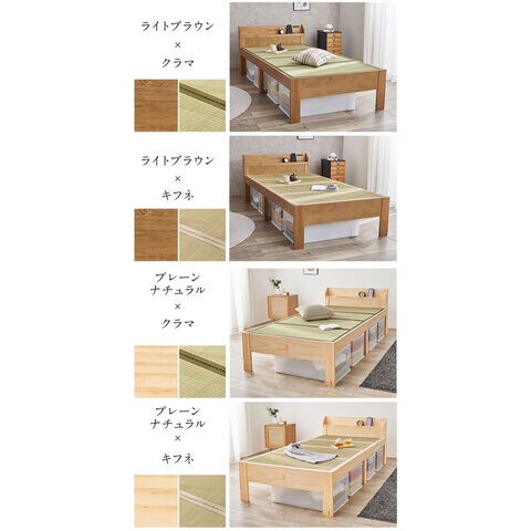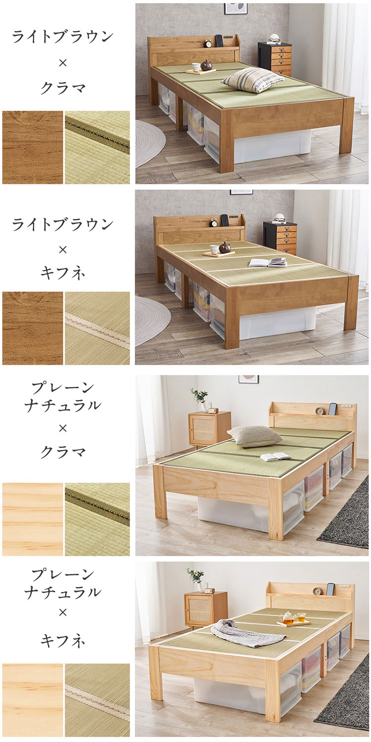 爽やかな天然い草を使用した畳マットをすのこベッドに合わせました。床面下の収納や立ち座りのしやすさに合わせて床面高さを調節可能。宮棚、コンセント付き。