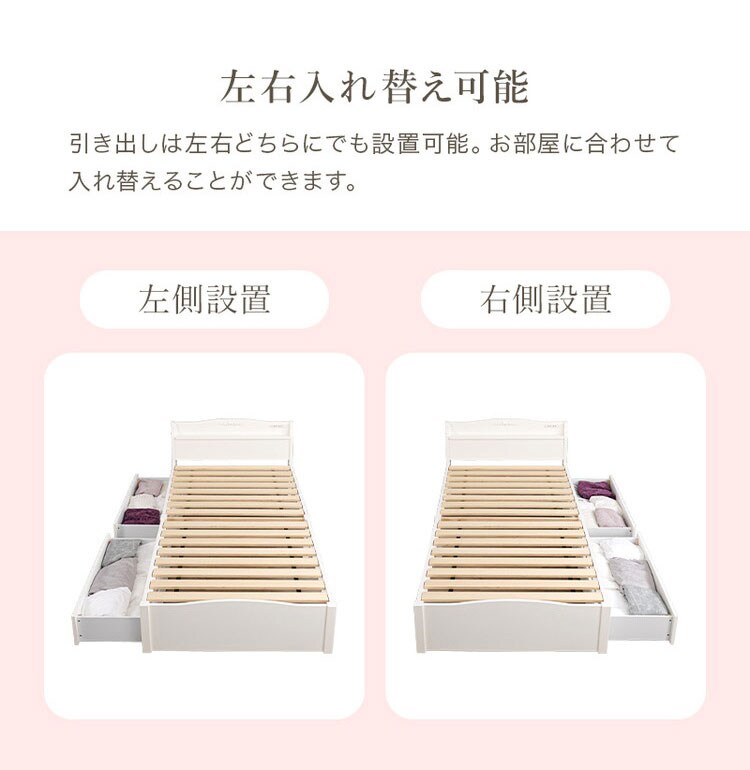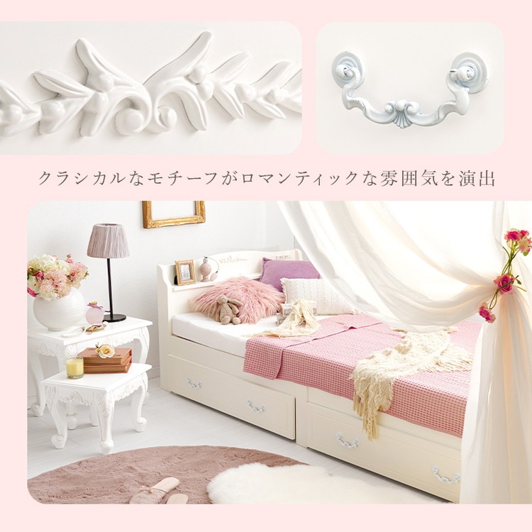 ネジなし、工具不要で簡単組立。クラシカルなモチーフをあしらったエレガントな引出し付きすのこベッド。