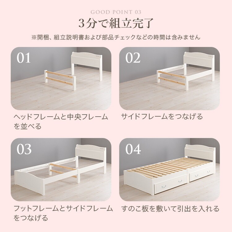 工具不要・簡単組立 姫系 収納付き ベッド シングル 耐荷重200kg 宮棚付き すのこベッド 白 ホワイト 可愛い かわいい ベッドフレーム 頑丈 北欧 ネジ無し おしゃれ 新生活【送料無料】