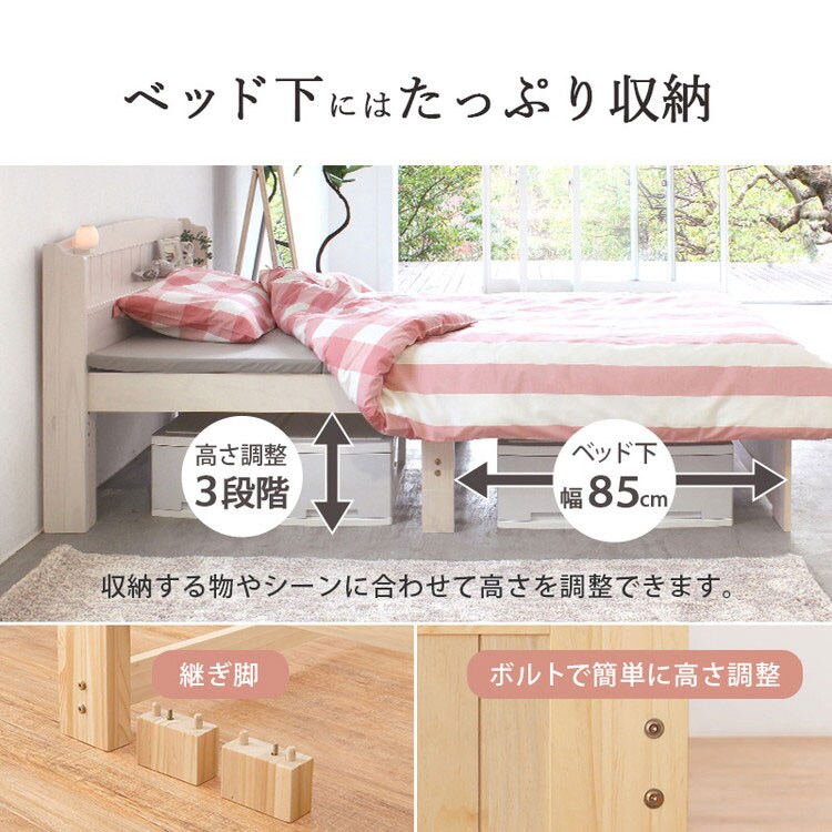 床面高さが3段階に調整出来る天然木すのこベッド。便利な棚と2口コンセント付き。安定感のある寝心地のボンネルコイルマットレスセット