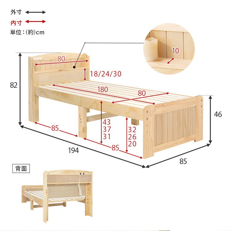 ベッド:(約)幅85×奥行194×高さ82×床面高31/37/43cm、マットレス:(約)幅80×奥行180×高さ14.5cm