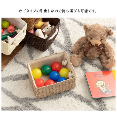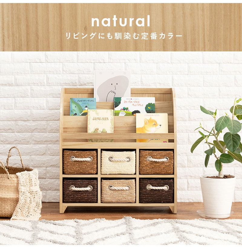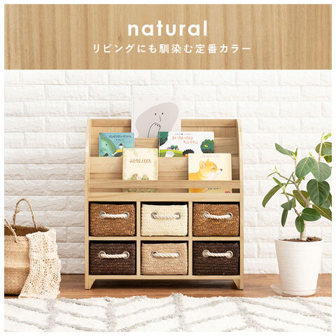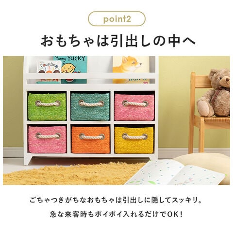 おもちゃなどを収納できる引き出しが付いた絵本ラック。引き出しはカゴ状で持ち運べて便利。