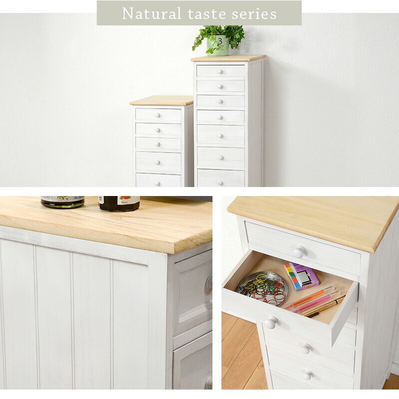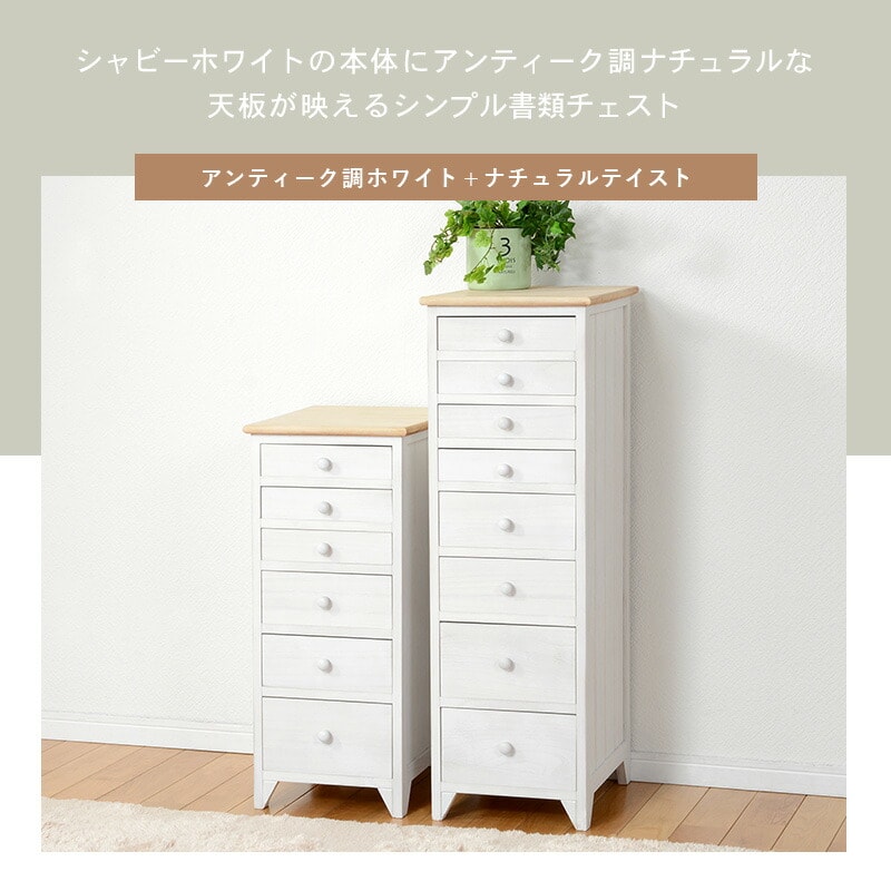 シャビーホワイトの本体にアンティーク調ナチュラルな天板が映える、シンプルチェスト。